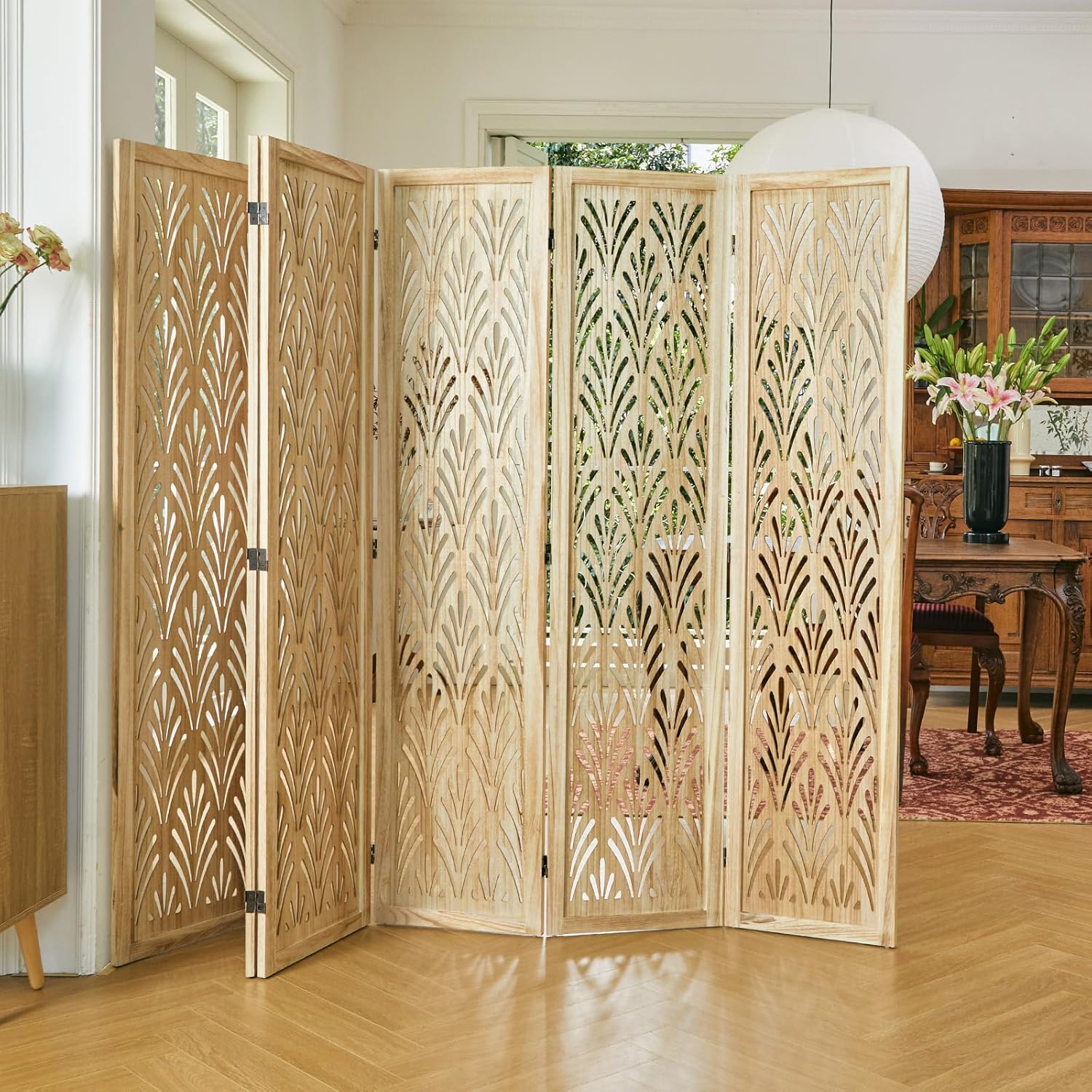 5.6Ft Room Divider Folding Wood Simple Carved Partition Screen for Home Office Garden - 6 Panels (Natural)
