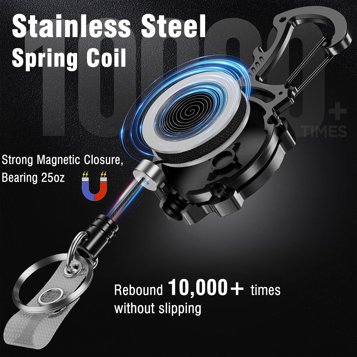 - [Multi-function tool] Cool tactical badge reel with key chain ring and ID badge clip not only can hang work ID name badge holder, keys, gadget buddy accessories, but also can help you open the beer cap smoothly. It can be fixed on belts, backpacks, handbags, outdoor tents. It also makes a great practical present for men, boyfriends, family, friends