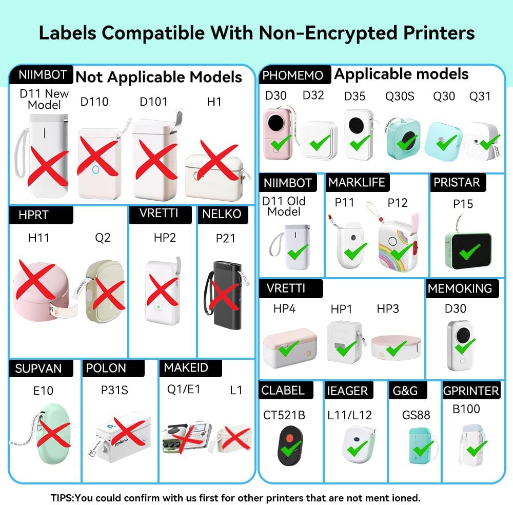 - Not Suitable For Encrypted Printer — NIMBOT D11 New Model, MAKEID Q1/E1/L1. You could confirm with us you are not sure whether it is suitable for other printers. Note: If you are unable to print, please check first: 1. Confirm whether the sticker is placed upside down, 2. Confirm whether the printer has sufficient power, otherwise charge it before use.