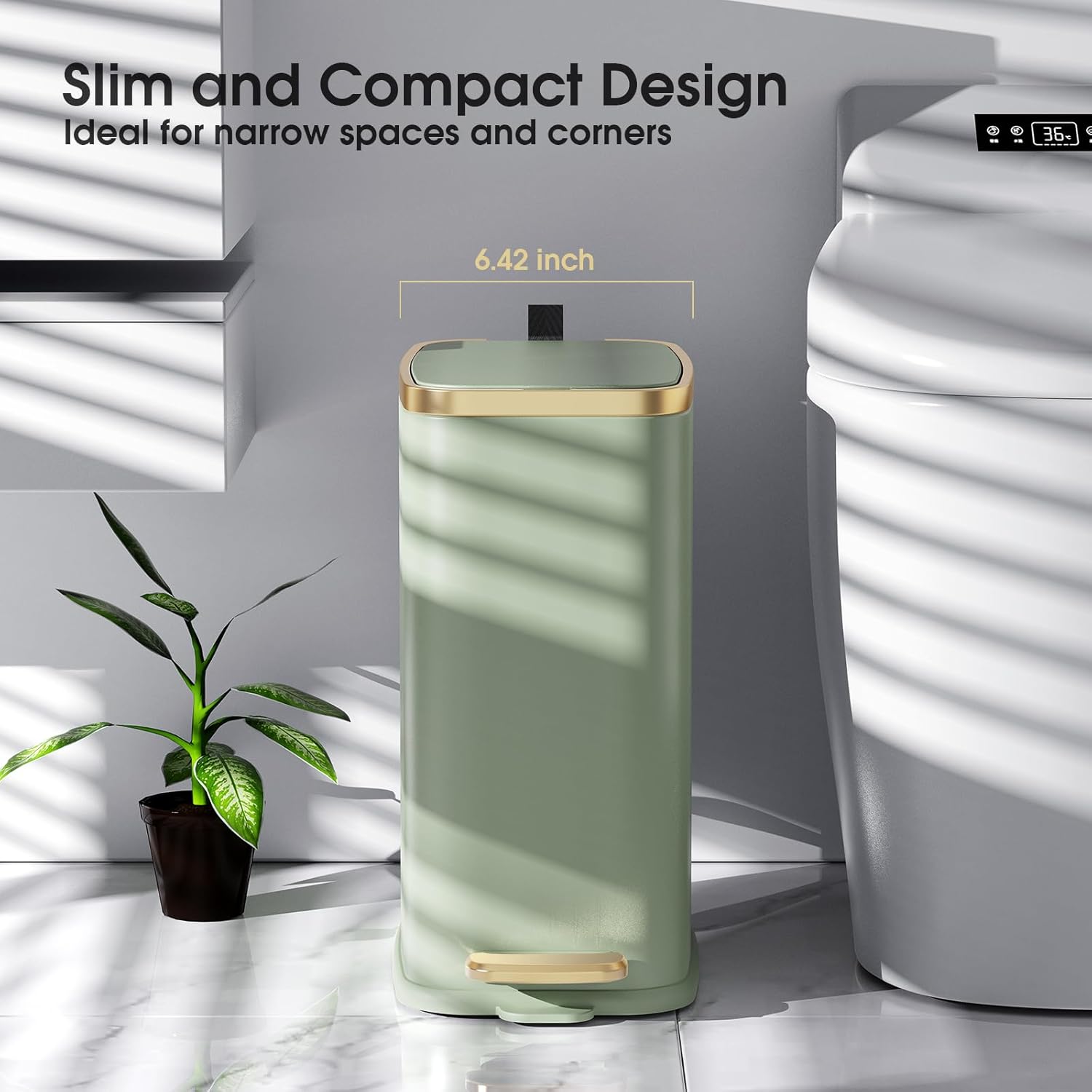 - Slim Design: The small rectangular trash can is easily fitting into Narrow spaces and Bathroom corners with its slender profile; such as bathroom, bedroom, office, toilet, kids room, powder room, farmhouse, apartments, campers, RVs, dorm rooms, etc