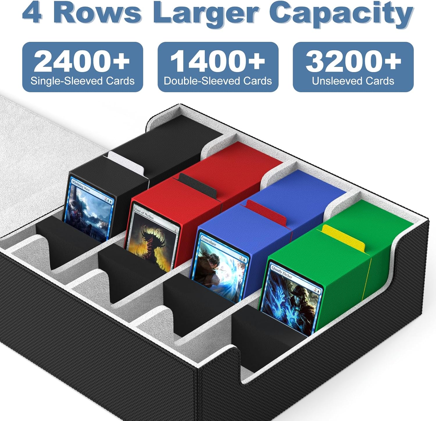 - 【4 Rows Larger Capacity】With dimensions of 11.49x12.67x4.21 inches, the card box effortlessly accommodates over 2400+ sleeved cards, 1400+ double-sleeved cards and 3200+ unsleeved cards, meeting all your card storage needs.