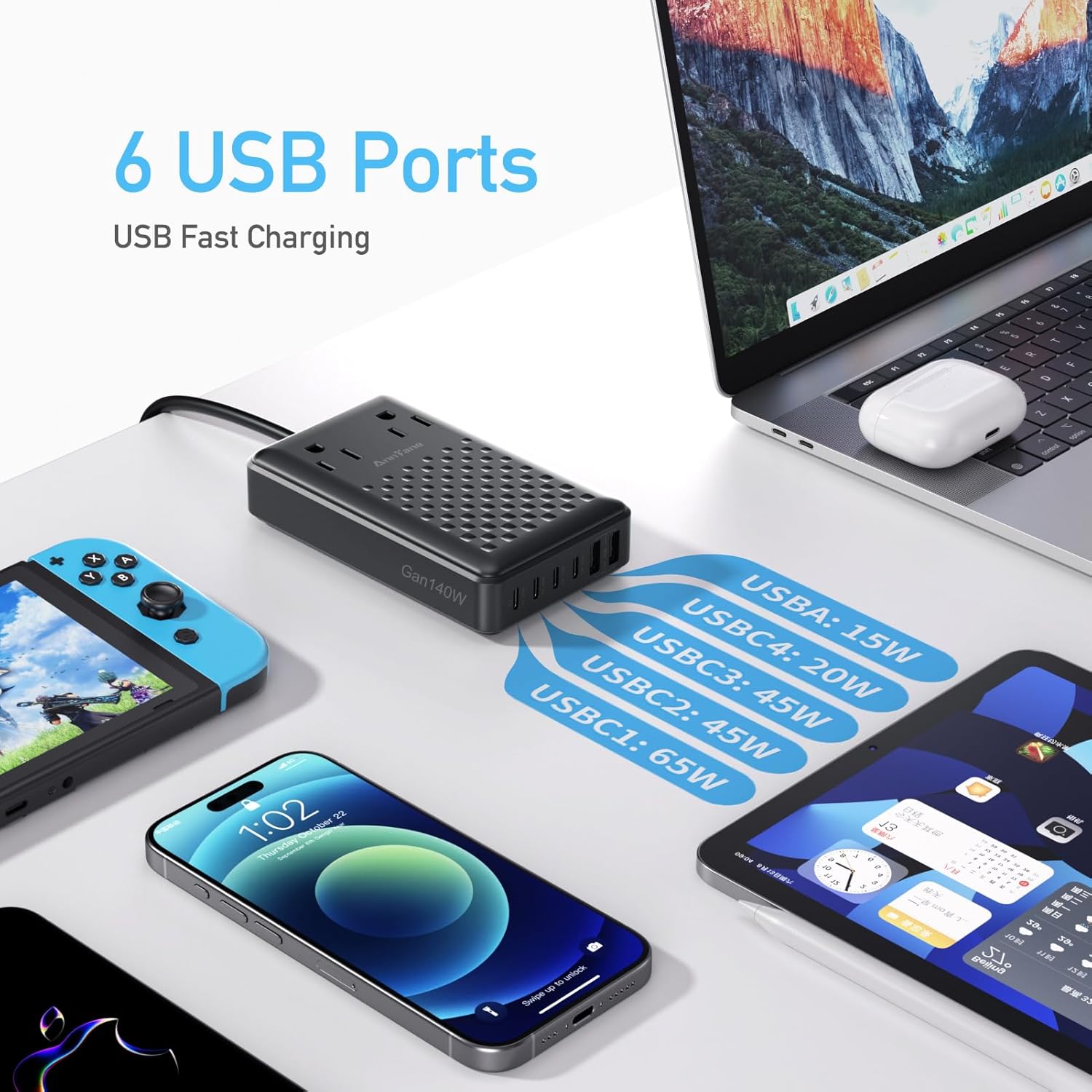 - 【140W USB C Charger Block】The usb charging station adopts the latest GaN III technology, and the maximum output power can reach 140W when 6 USB ports are connected to the devices at the same time, which can be used for fast charging of mobile phones, tablets, laptops and almost all other devices!