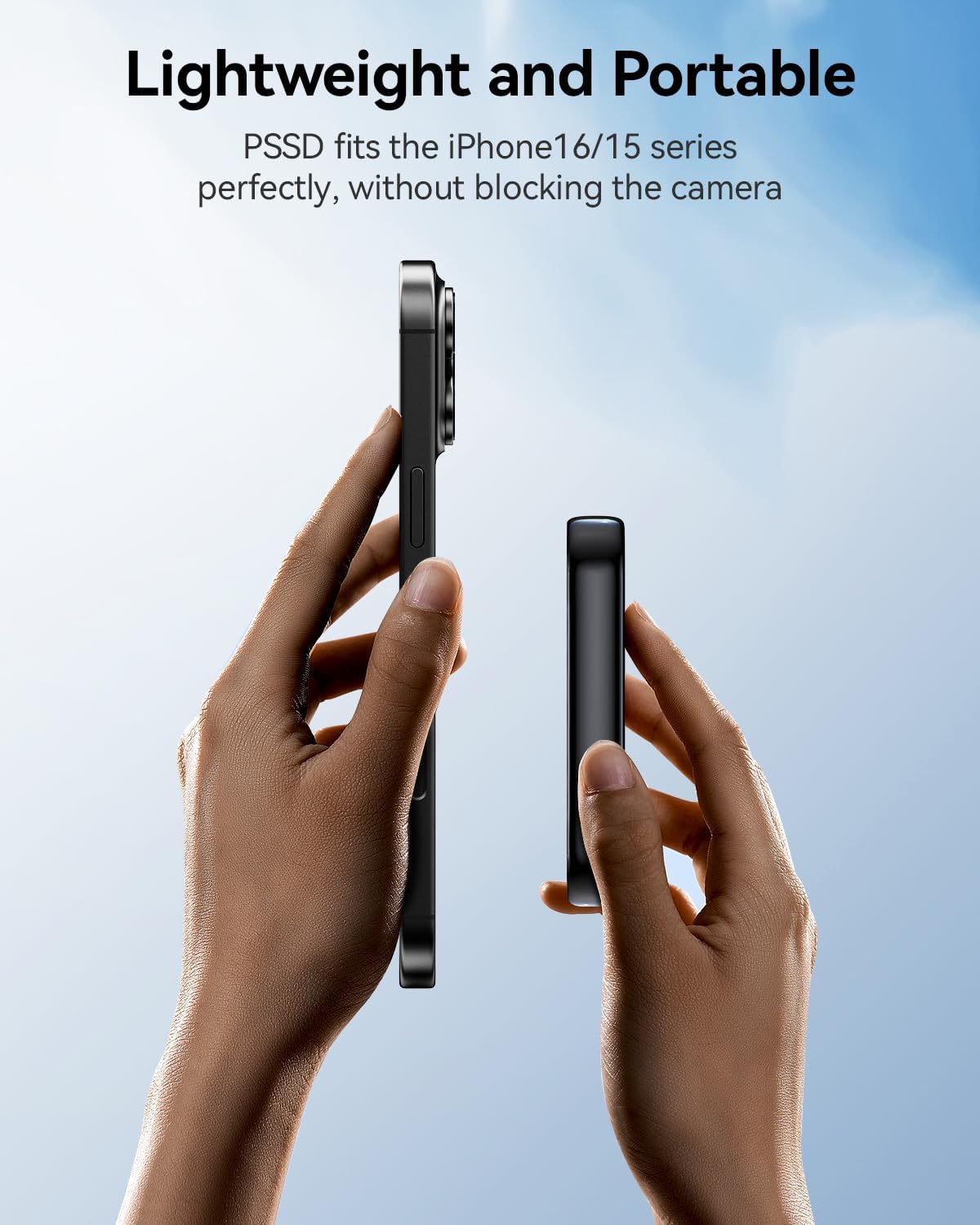 - 【Magnetic Design】PSSD can be directly attached to iPhones and phone cases with MagSafe support, and it also includes a magnetic ring for attachment to devices and cases without built-in magnets. This makes it the ideal choice for mobile photography enthusiasts, allowing you to store a large number of high-resolution photos and videos anytime, anywhere, combining portability and efficiency perfectly.!!Note: When using the PSSD with a phone case, it is recommended to use the included magnetic ring to prevent detachment due to insufficient magnetic force.