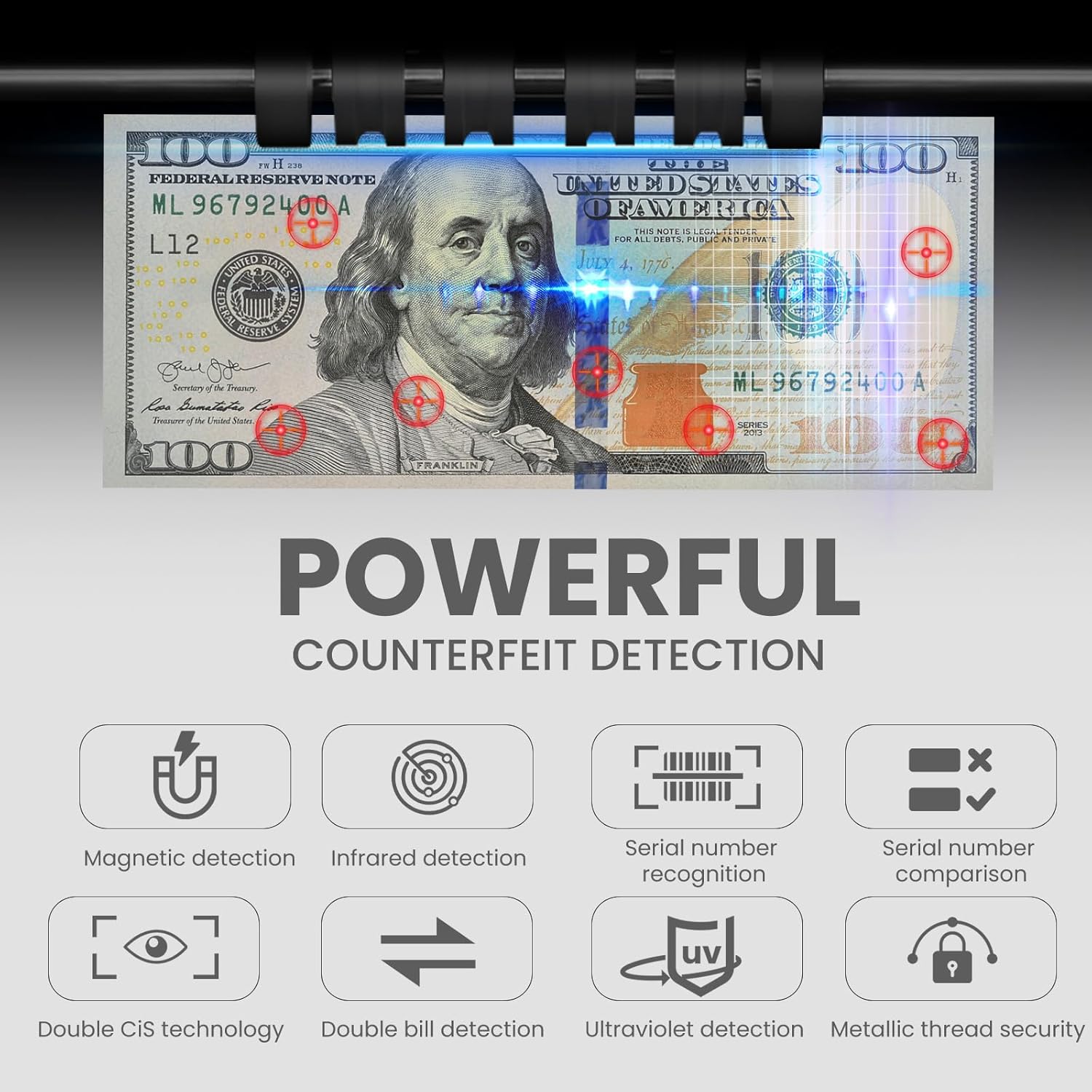 - Bank Grade Counterfeit Detection:Advanced counterfeit detection sensor 2CIS, UV, MG, MT, IR, DB,ensure 100% accurate counting. Serial number comparison function can Prevent receiving Spliced notes, protect your business from loss. Perfect for bank, credit union, exchange shop, police department, supermarket .etc
