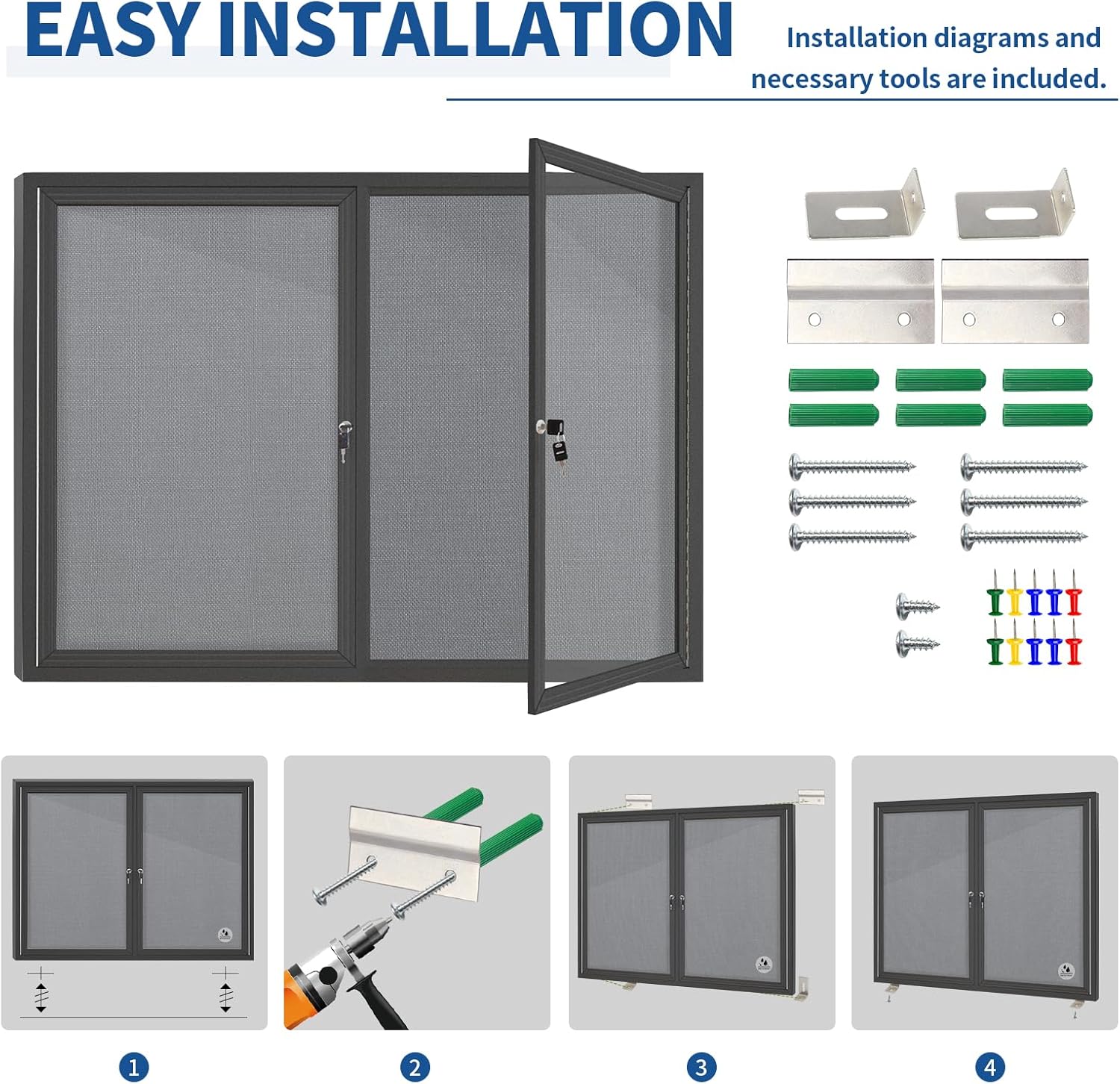 - Effortless Installation: With its user-friendly design and comprehensive mounting tools, setting up our enclosed bulletin board is a breeze. Measuring 44x32 inches, it fits seamlessly into any space for added flexibility and convenience.