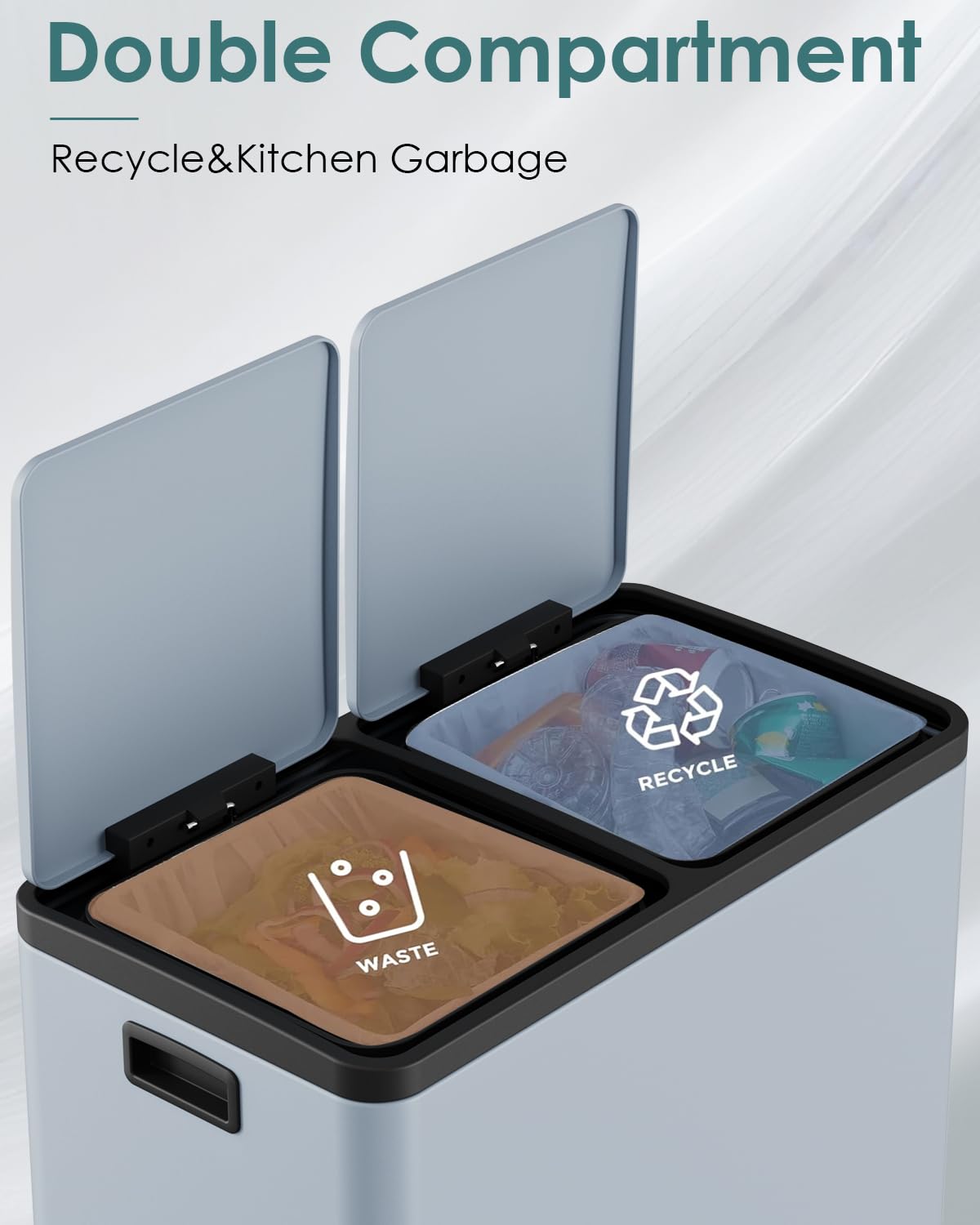 - 2*8 GALLONS COMPARTMENTS: Trash can has two independently compartments for trash and recyclables, making it easy to sort waste.