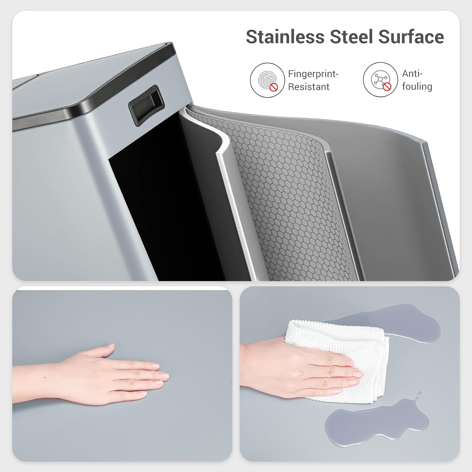 - DURABLE&STYLISH: Trash can is made of durable and fingerprint-proof stainless steel, which is easy to clean and maintain. High-quality thick 410 stainless steel has a capacity of 16 Gallon/60-Liter, perfect for homes, offices, and other spaces with high waste generation.