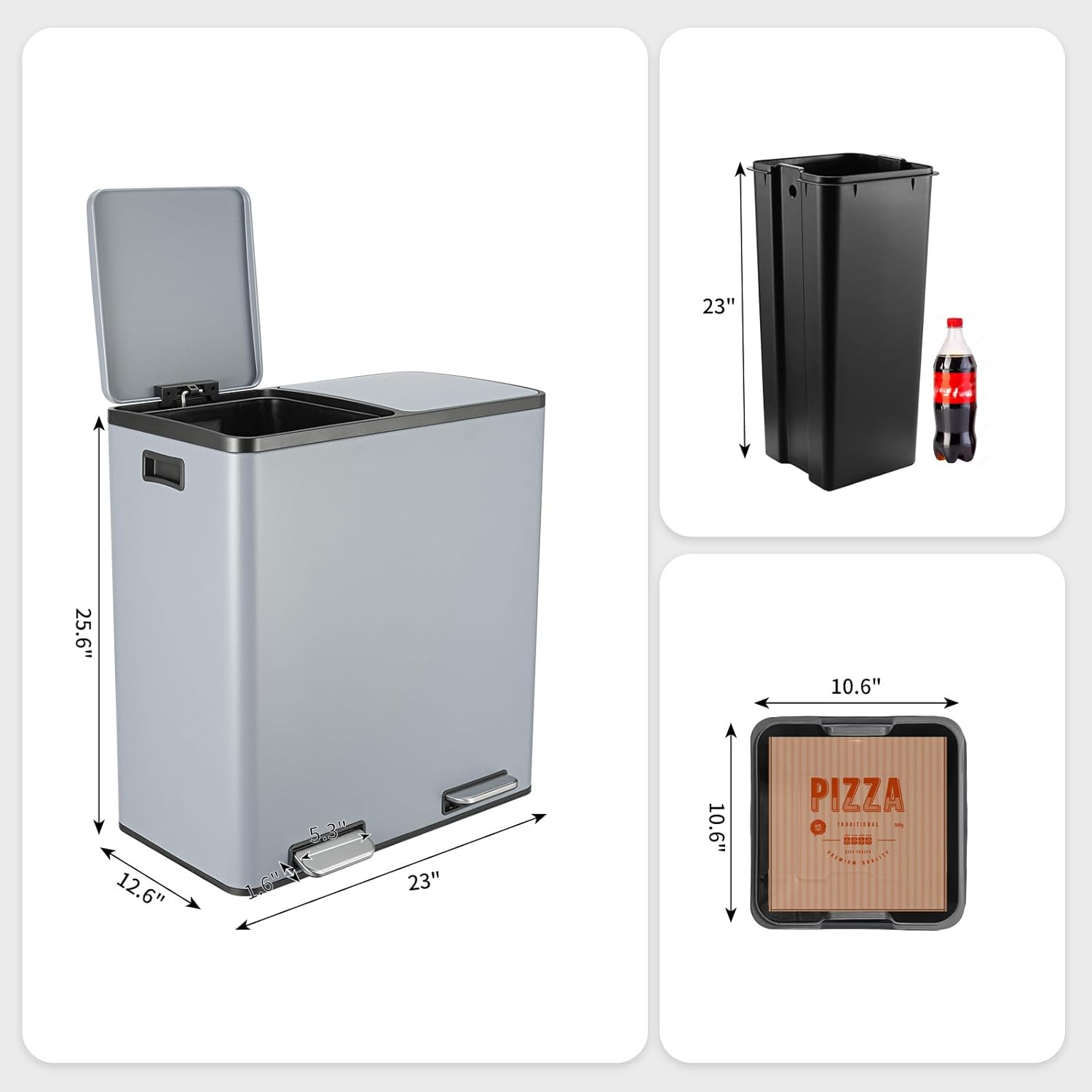 - WIDEN PEDAL&SIDE HANDLES: Dual trash can includes 2 non-slip metal pedals that can open 2 lids individually, free your hands and cleaner. With 2 portable side handles, we can move it easily.