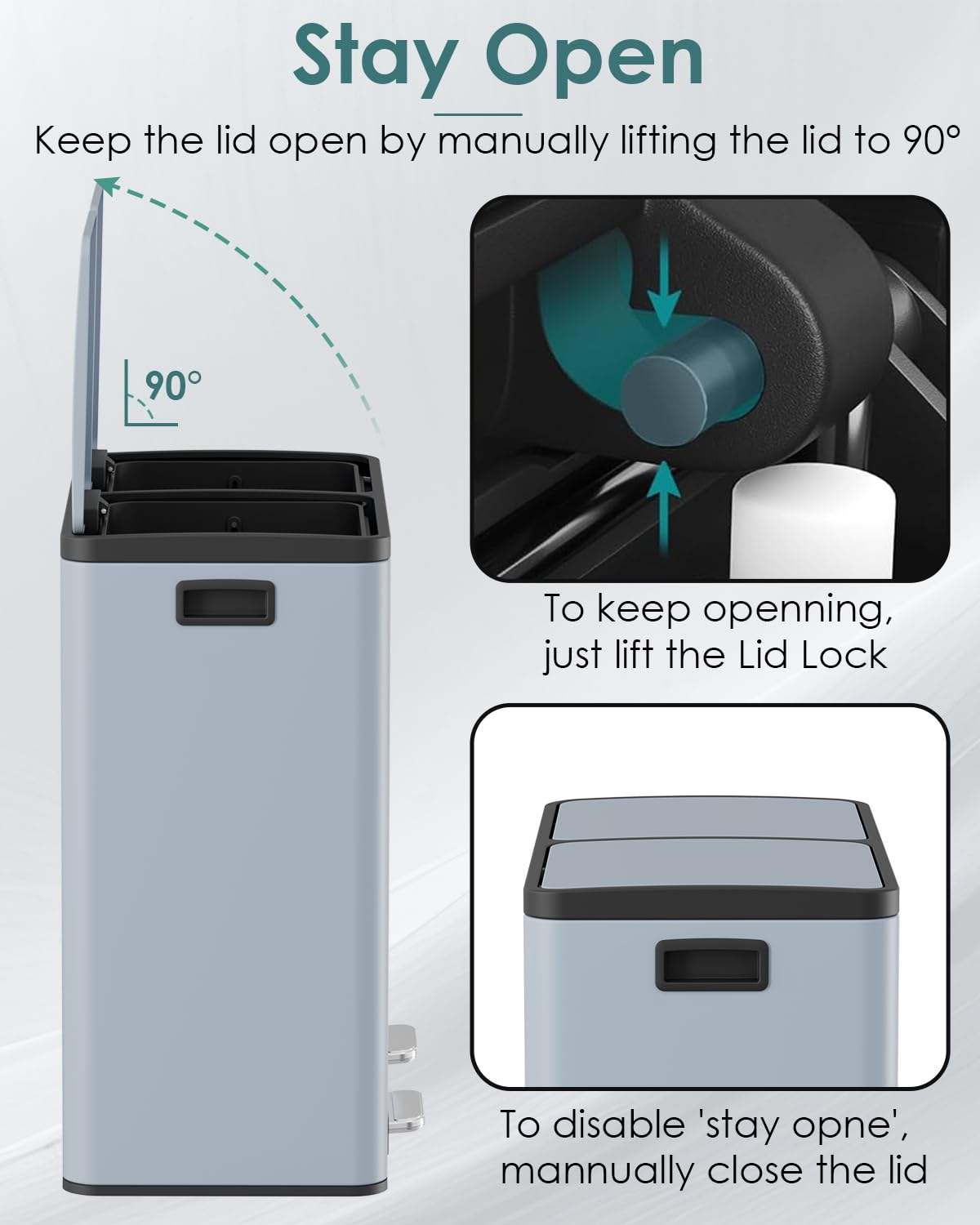 - GENTLE&SEALED LIDS: 60L trash lid is designed with ABS hydraulic deceleration to close gently and silently, minimizing noise and preventing it from slamming shut. Sealed lids fit tightly to block unpleasant odors, keeps your home smelling fresh and clean.