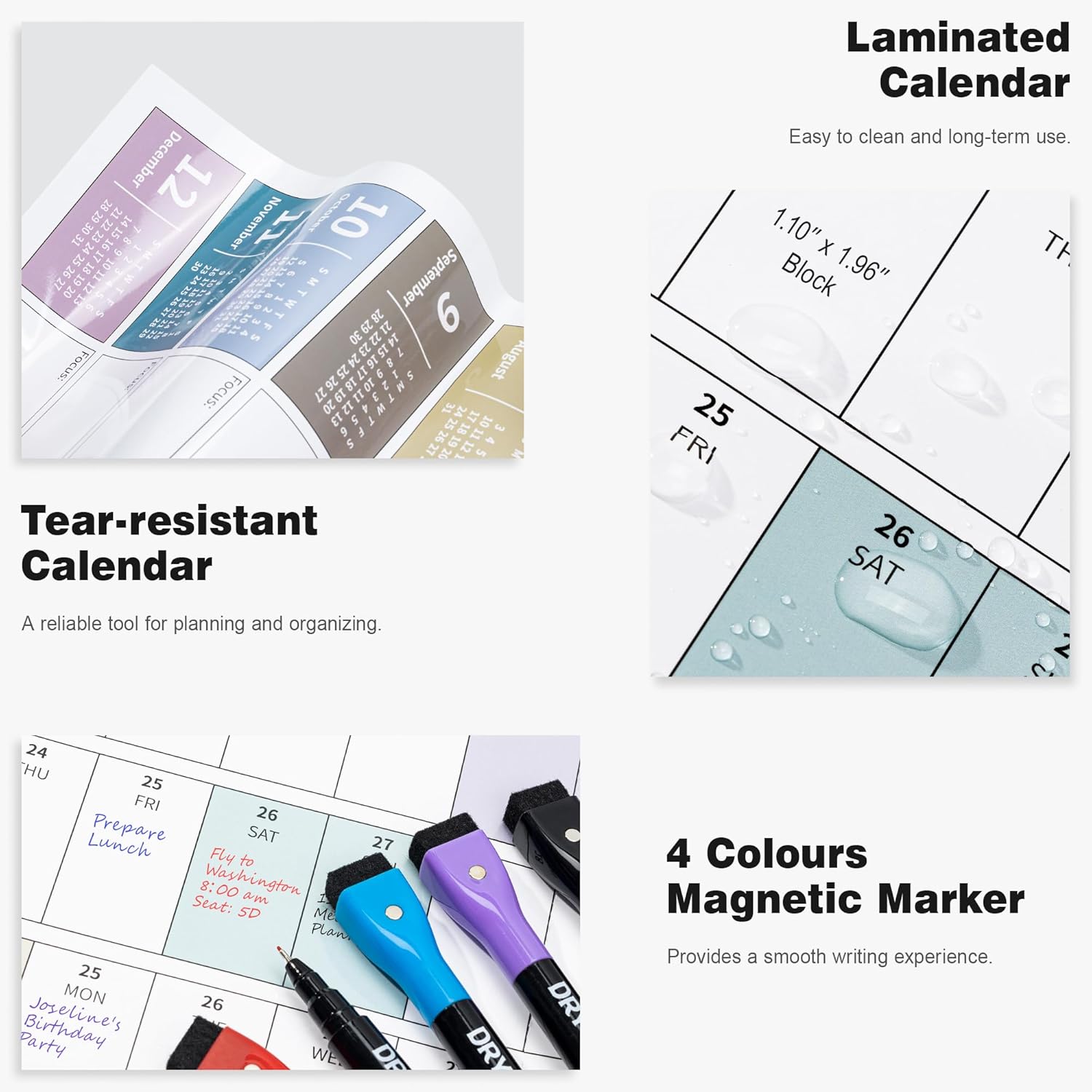 - ✨ Laminated Calendar with Dates: Waterproof wall calendar comes with a mini eraser, four dry-erase markers, 12 push pins, and 10 transparent round stickers. 12 months calendar covers the time range from Jan 2025 to Dec 2025, making it perfect for long-term use.