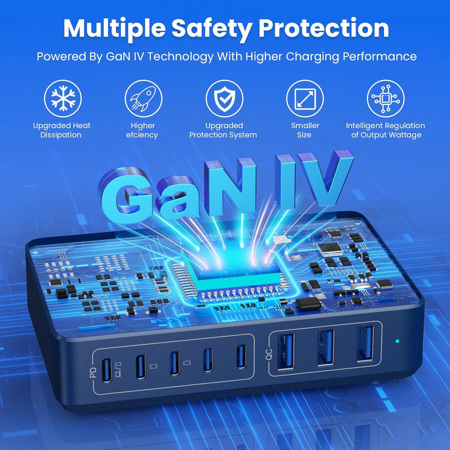 - 【Latest GAN Ⅳ Chip Technology Charger Station】The USB C charger adapted GaN Ⅳ generation chip technology, built-in multi-protection system and premium microchips. With higher energy efficiency, higher resistance to radiation and upgraded heat dissipation, Gallium Nitride (GaN) makes our chargers smaller and safer without sacrificing a drop of power. Trustworthy Charging Station with 3 Years Warranty!