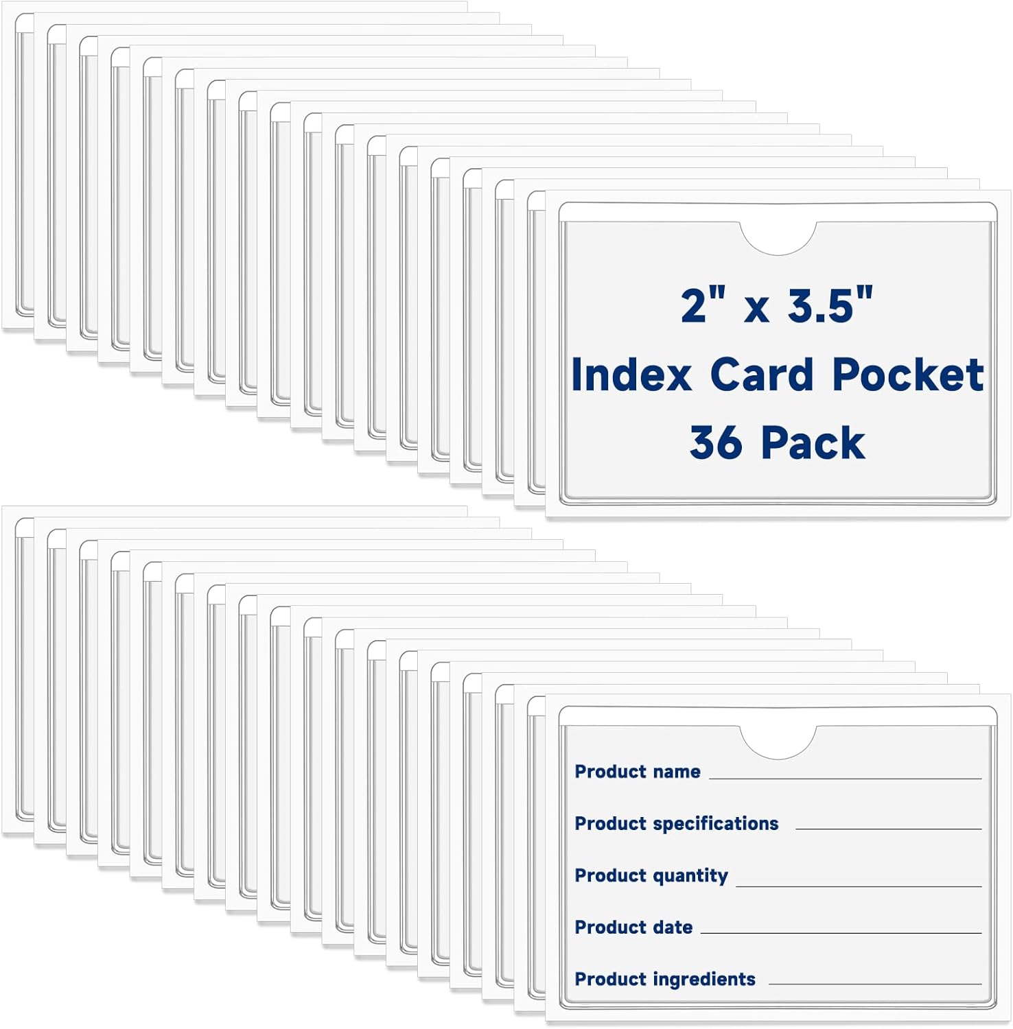 36Pcs Adhesive 2" x 3.5" Index Card Pockets, Clear Label Holders with Top Open for Loading, Plastic Pocket Sleeves for Organizing Storage Bins, Library Cards, Shelves
