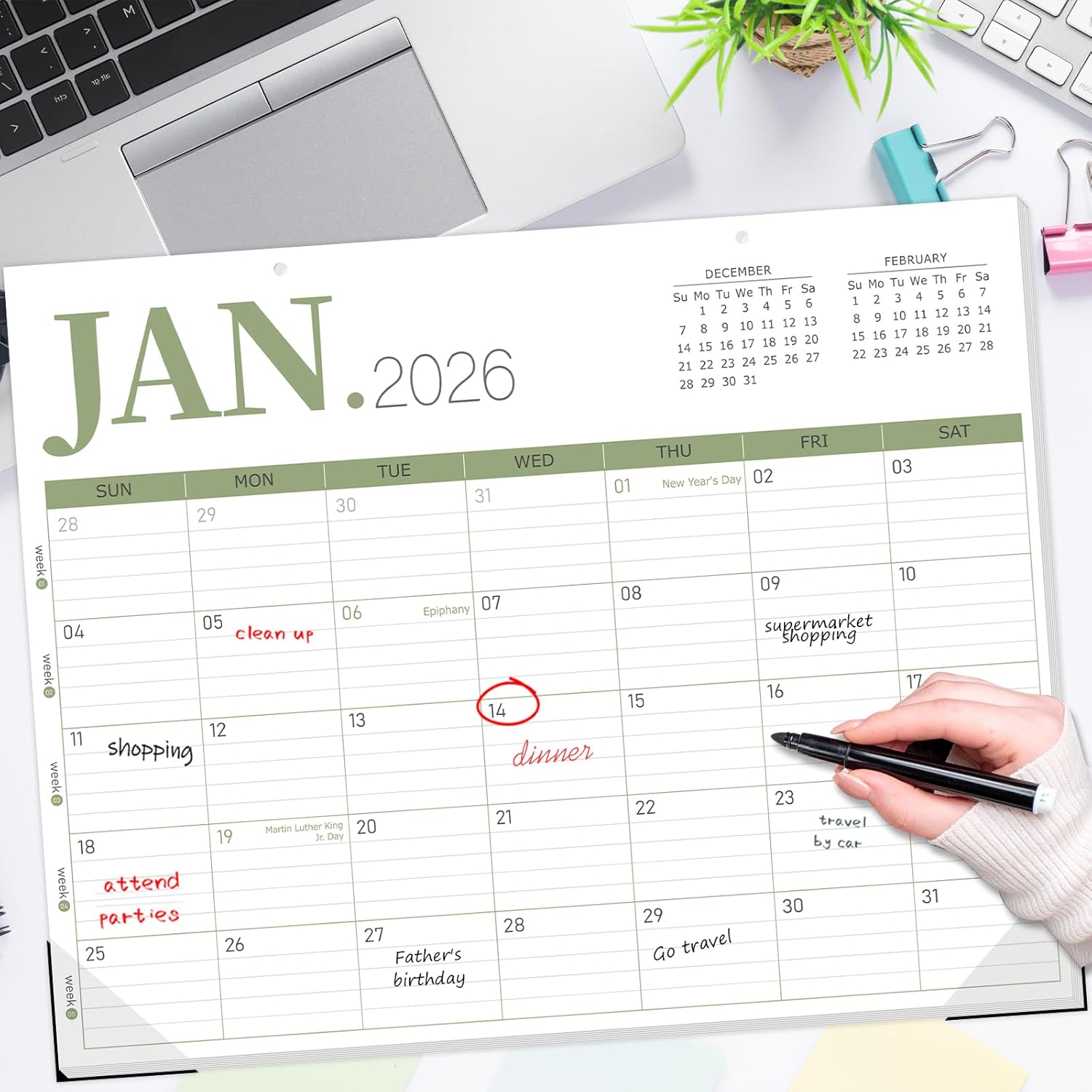 - Stay Organized All Year Long: With this 2026 desk calendar, you'll enjoy 18 months of detailed planning, from January 2026 to June 2027. The first page of the desk top calendar offers a full year preview of all the months, making it easy to plan ahead. The large 14" x 11" monthly layout offers ample space to jot down appointments, deadlines, and important reminders, making it perfect for home, school and office use
