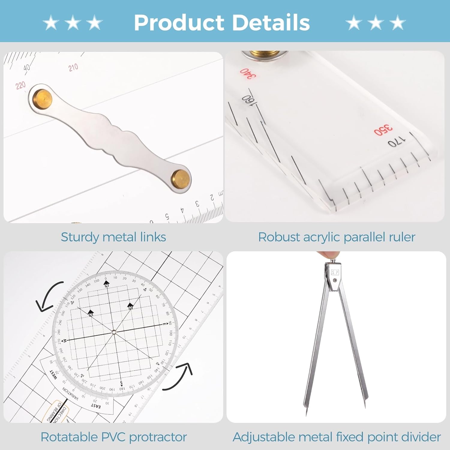 - Comprehensive Navigation Kit: This marine navigation set equips you with a marine parallel ruler, a marine protractor, and a fixed point divider, ensuring you have every tool necessary for precise and efficient navigation tasks
