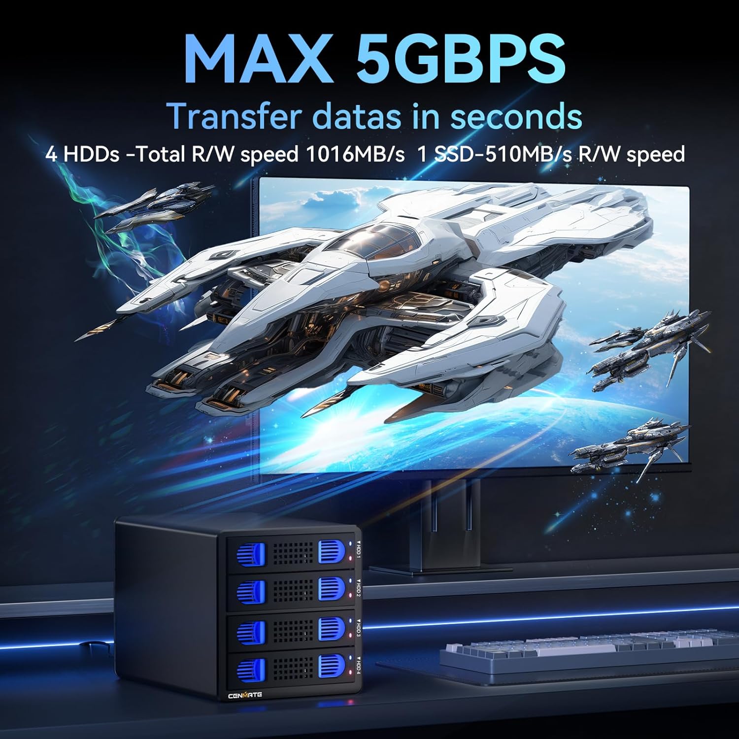 - 【Reliable External Storage System for Individuals and Business】The 4 Bay Hard Drive Enclosure supports 2.5/3.5 inches HDD and SSD, max capacity up to 80TB( 20TB for each hard drive), it's a ideal external hard drive enclosure for personal or enterprise using.Save space on your desktop or laptop.