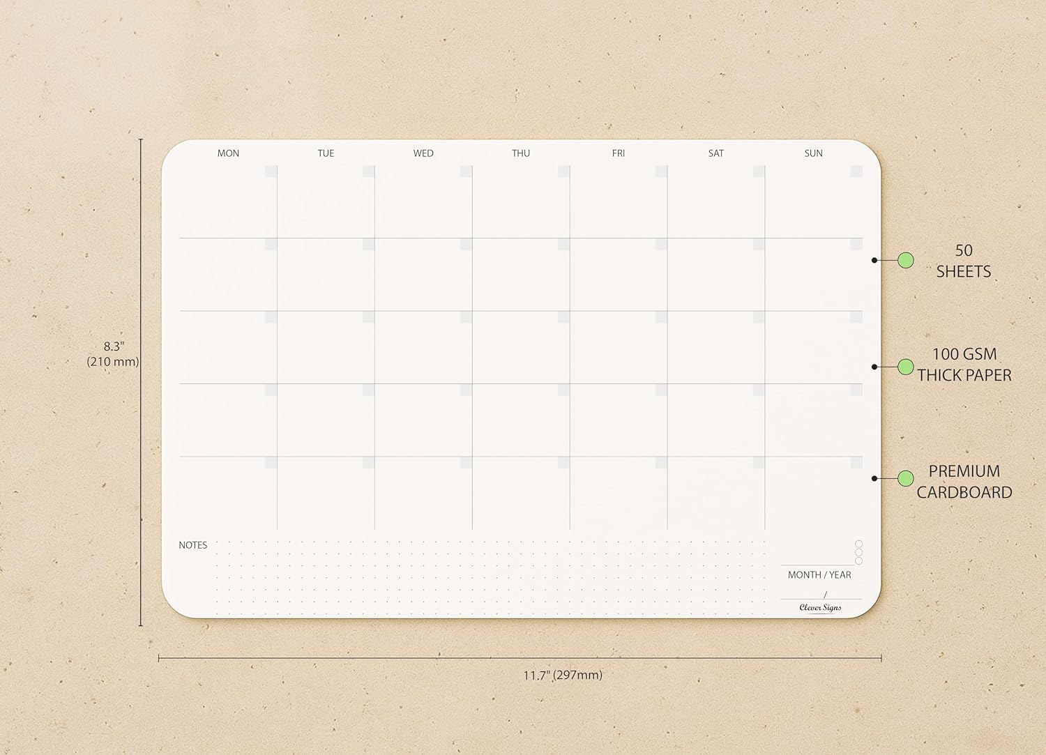 - CONVENIENT FORMAT: Sheets are designed to be clear and easy-to-use. The hard back cardboard support provides a sturdy surface for writing. CLEVER SIGNS Undated Monthly Planner Notepad measures 8,3 X 11,7 inches and is made with high-quality thick paper.