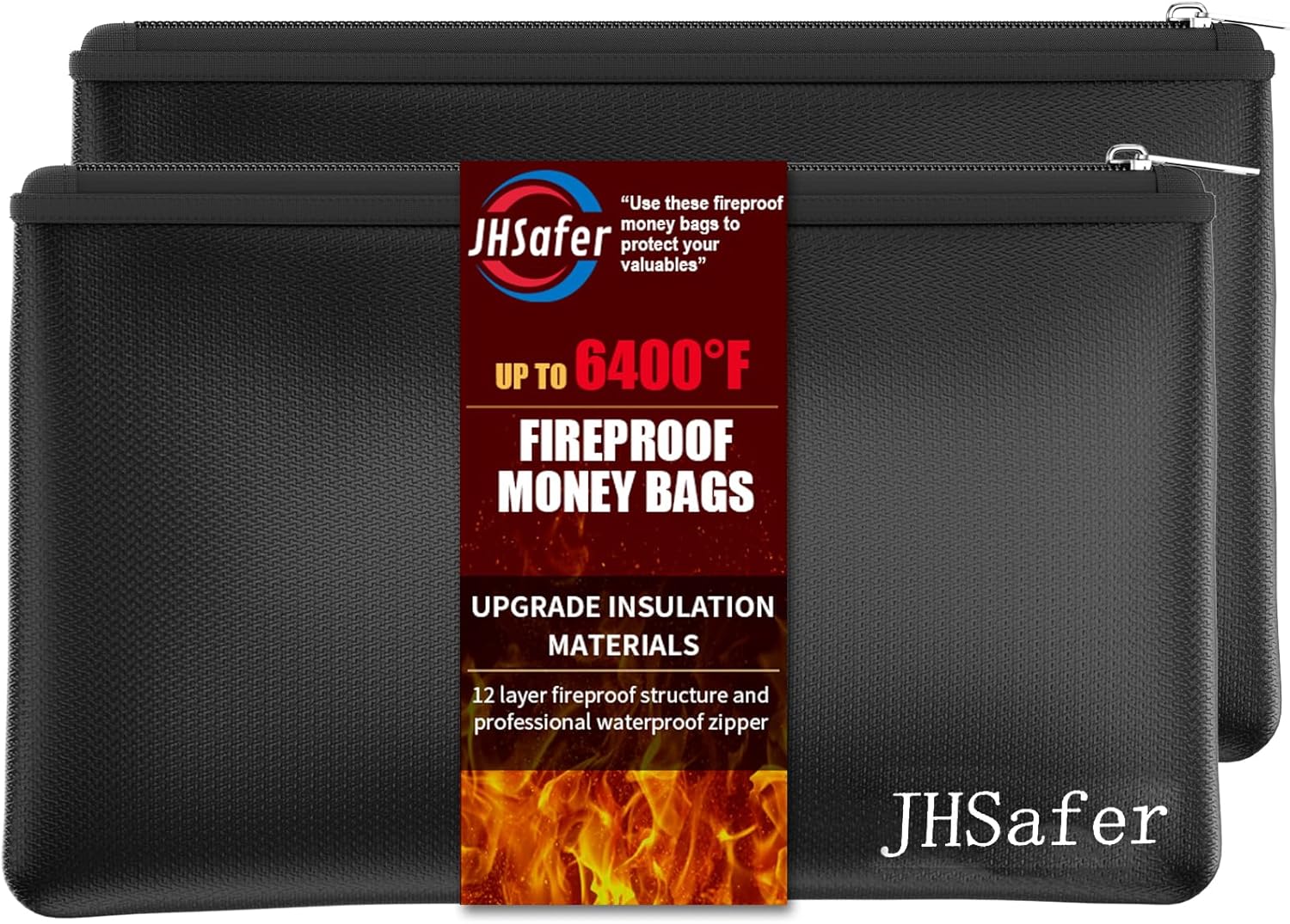 - Excellent Fireproof: Our fireproof money bags are made of 12 layers fireproof structure(1.Water & Fire Resistant Silicone Coating 2.High Temperature Fiberglass Layer 3.High Temperature Resistant Base Cloths 4.High Temperature Thermal Insulated Layer 5.Flame Retardant Reinforced Layer 6.Thermal Insulated Layer 7.Flame Retardant Layer 8.Thermal Insulated Layer 9.Heat Resistant Layer 10.Upgraded Flame Retardant Insulation 11.Fire-resistant Fiberglass Layer 12.Upgraded Aluminum Foil Layer);The fireproof cash bags can withstand temperatures of up to 6400°F