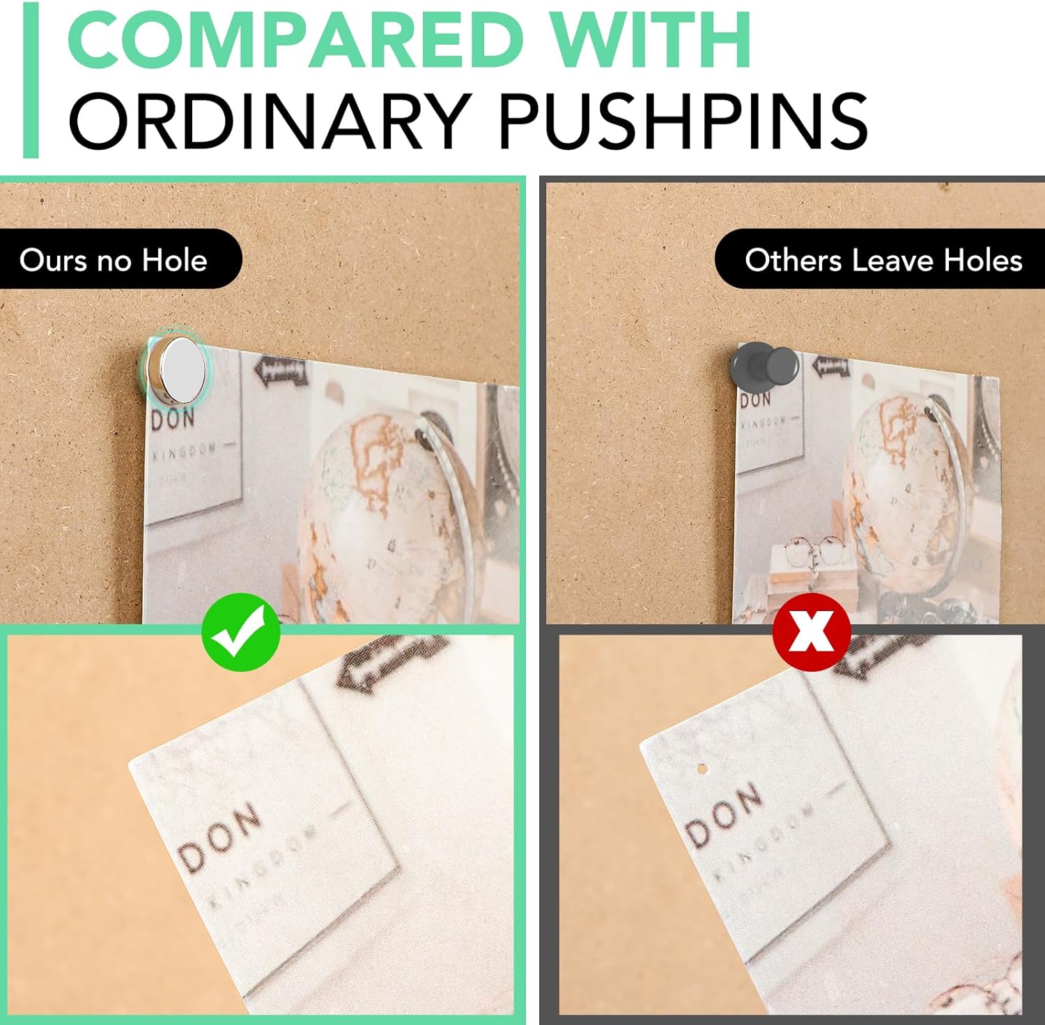- 【UNIQUE DESIGN】: Compared with traditional thumbtacks, our products are composed of magnets and thumbtacks. Using our magnetic push pins will not leave holes when hanging notices and posters, and can maintain the integrity of photos.