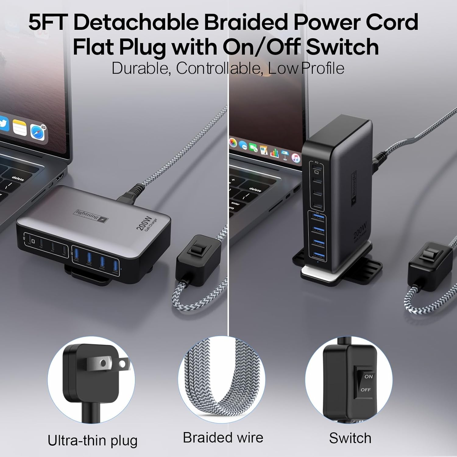 USB C Fast Charger Block 200W, 8 Ports Charging Station for iPhone/Ipad/MacBook, 4C4A GaN Charger Box, Flat Plug Multi Chargers for All Devices 5ft Braided Power Cord with On/Off Switch