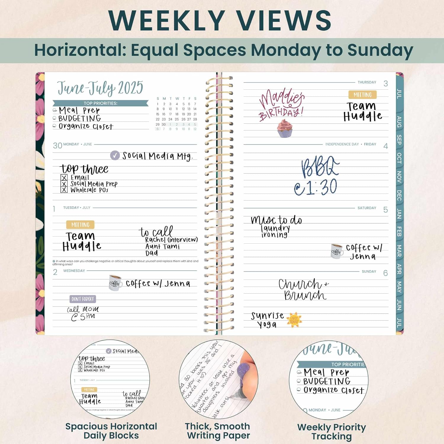- WEEKLY & MONTHLY LAYOUT FOR EASY PLANNING! Featuring spacious weekly planner pages and two-page monthly planner spreads, this day planner runs from July 2025 through July 2026—giving you over 365 days to track appointments, tasks, and goals.