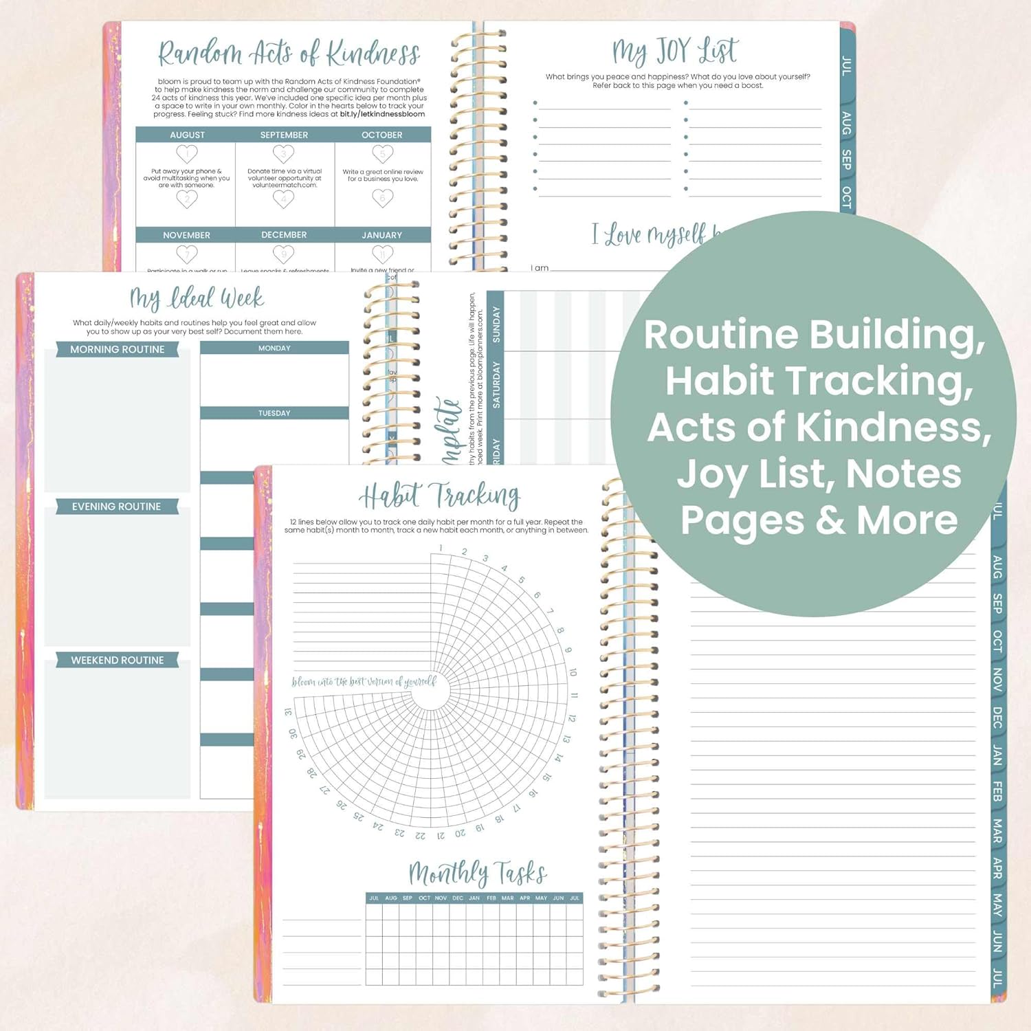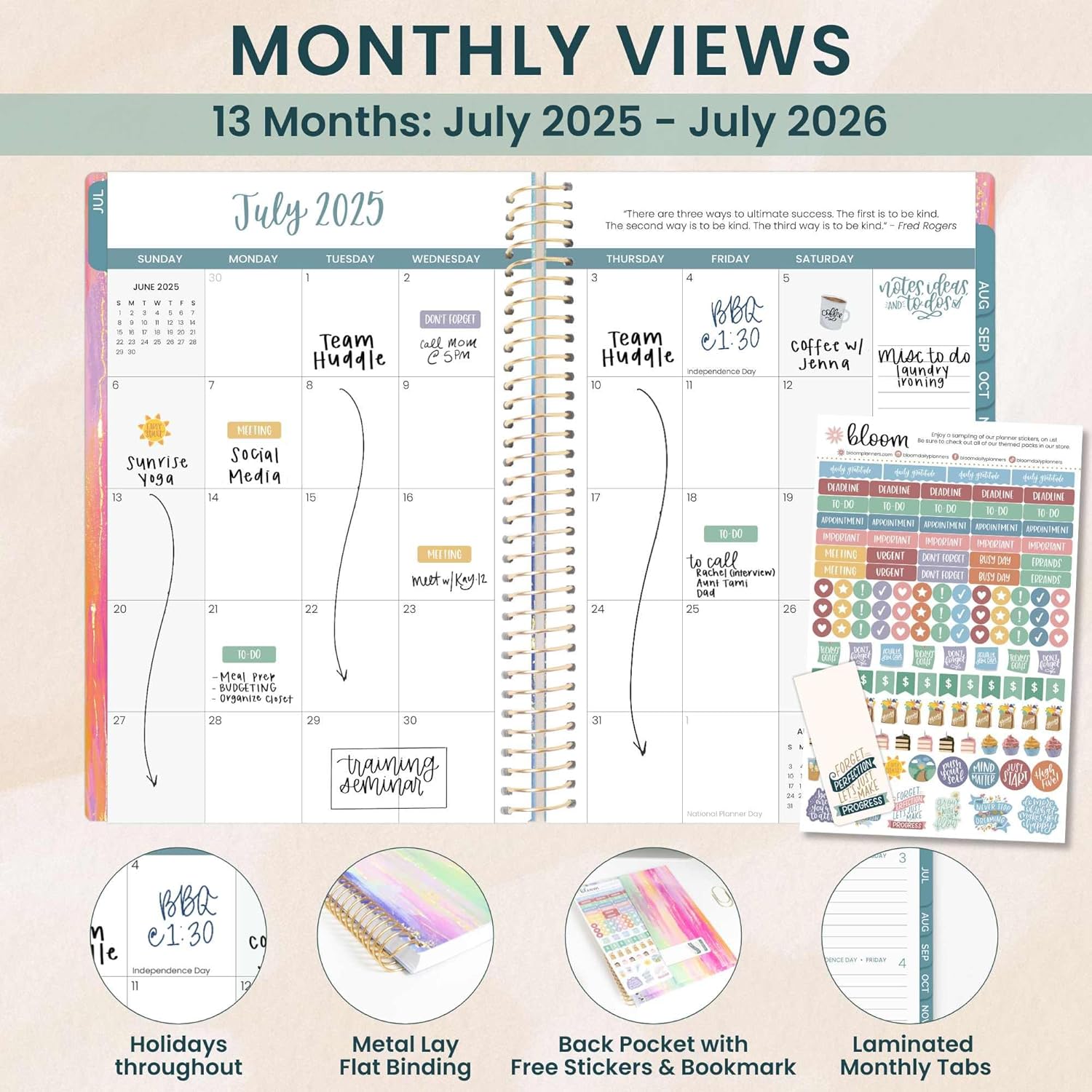 - PREMIUM FEATURES: Soft, lightweight covers made from thick cardstock with gloss film lamination, monthly tabs, deluxe 100gsm bright white bleed-resistant paper, recyclable metal lay-flat spiral binding, front and back inside storage pockets, and a FREE sticker sheet and bookmark!