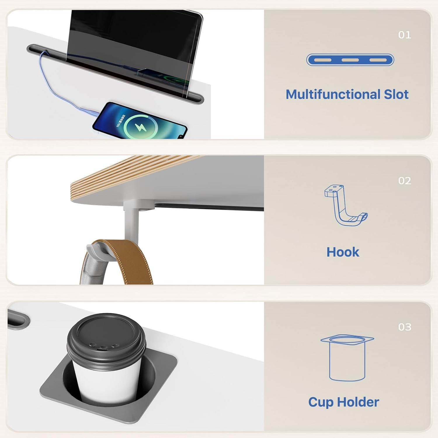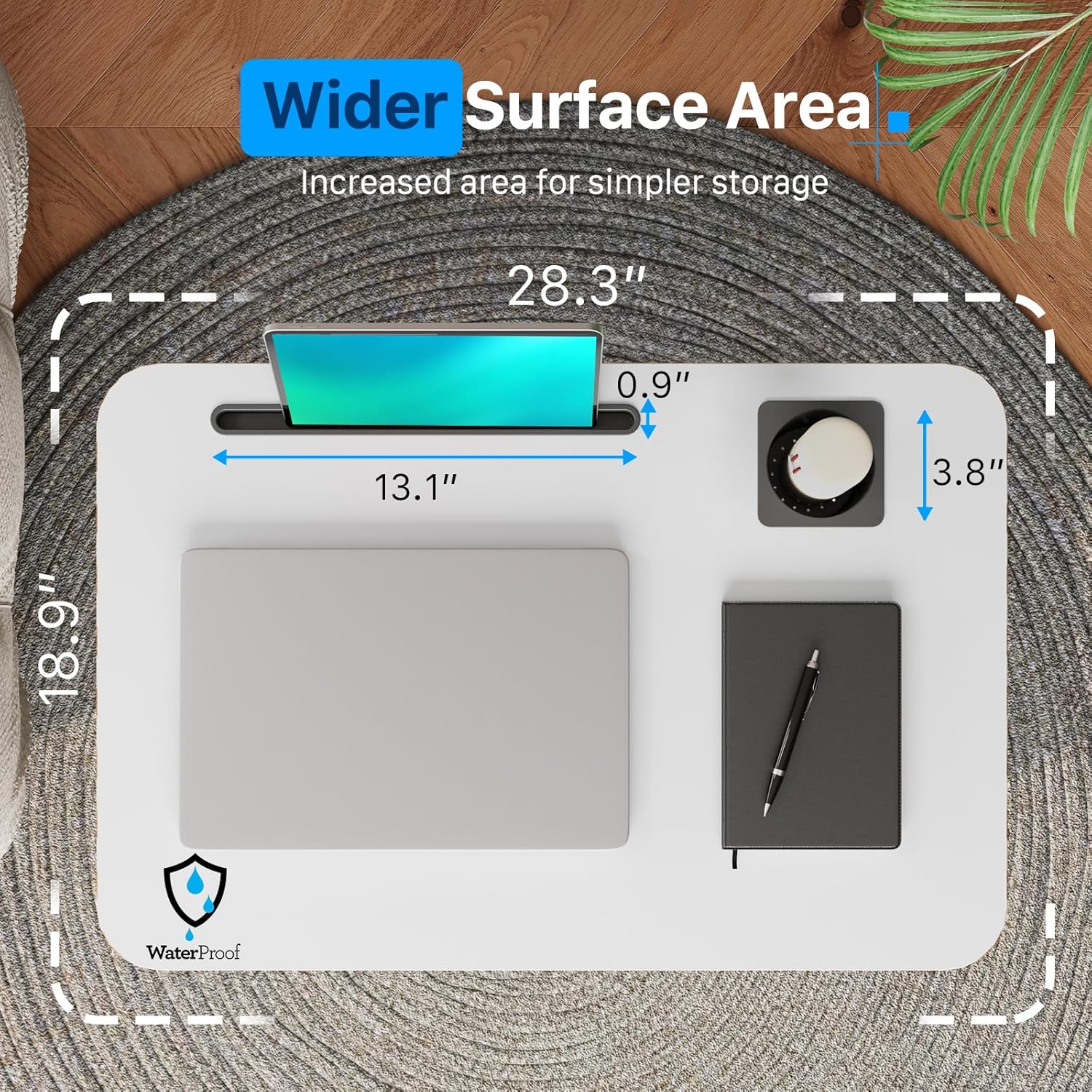 - Multipurpose Mobile Laptop Desk: 28.3''x19'' rolling desk is equipped with cup holder and dedicated slots, it's a good way to contain your drink and office supplies. Meanwhile, Hook design makes it convenient to organize your headset or backpack.