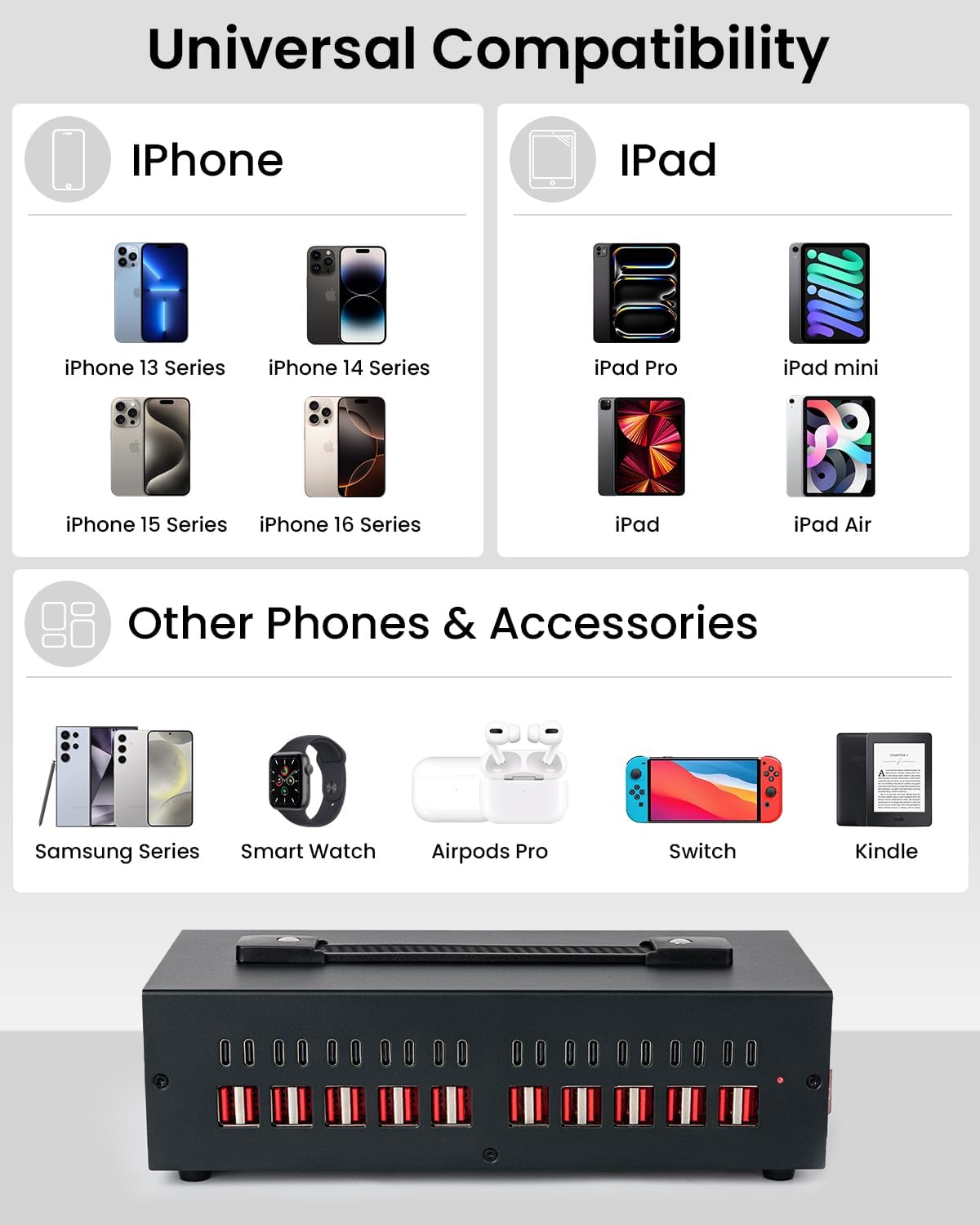 - Universal Compatibility: Designed for fast and safe charging, this multi device charging station is compatible with iPhones, Android phones, tablets, power banks, laptops, headphones, and other USB-enabled devices. Compatible for iPhone 15/14/13/12 Pro Max, iPhone SE, iPhone 11, iPhone X/XR/XS/XS Max, iPhone 8/7/6, iPad, iPad air, Table, Kindle, Sumsang Galaxy, Motorola, HTC, LG and more
