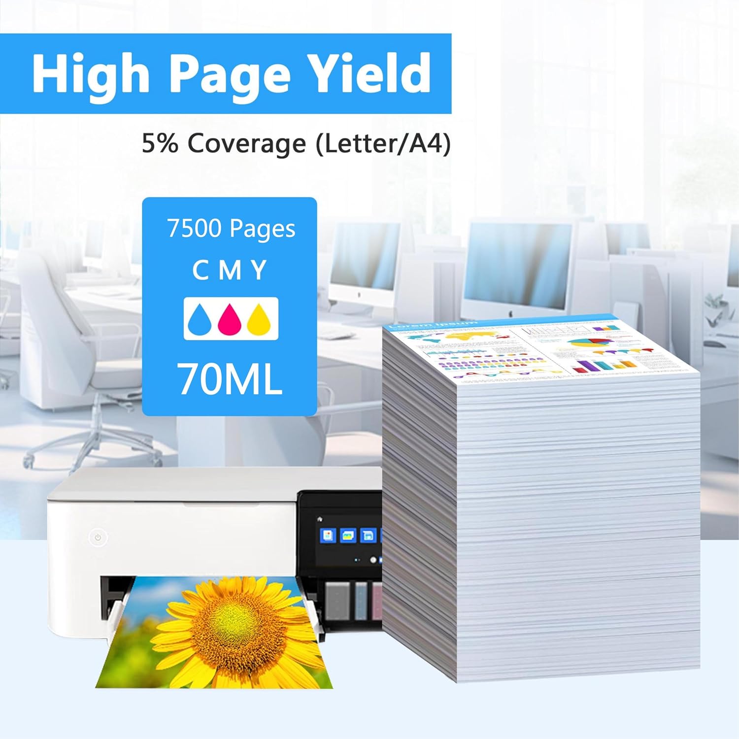 - High Capacity: Extra-large capacity ink bottle, longer replacement interval. Includes 6 Ink Bottles: Up to 7500 pages per T522 Cyan/Magenta/Yellow ink bottle in 70ml (with 5% Coverage of A4 paper).