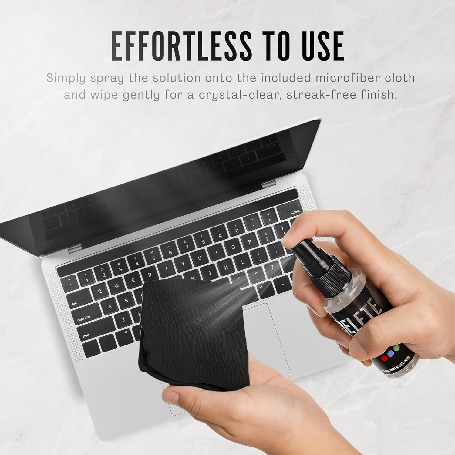 Delete Screen Cleaner Spray Kit, 4 Pack, 2oz Bottle and 12"x12" Microfiber Cleaning Cloth, Streak-Free, Safe and Gentle Formula, Multi-Purpose for Travel, Small TVs, Cameras, Laptops, Phones