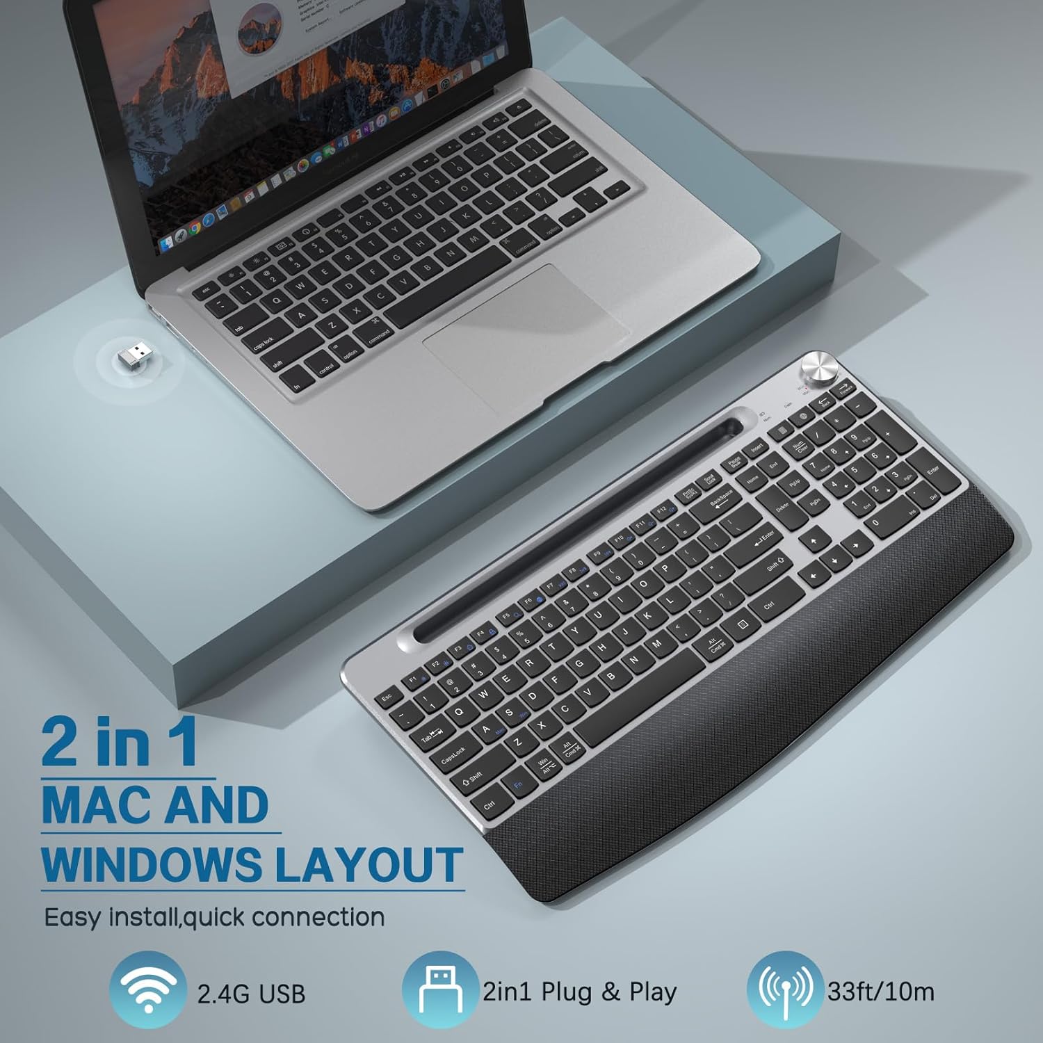 - Wireless Ergonomic Keyboard with Wrist Rest:The wireless keyboard is equipped with a wide palm rest and tilted legs, helping you keep your wrists and forearms in a more natural and relaxed posture. The low-profile wireless keyboard makes soft clicks during typing without disturbing others during rest, work or play. The specially designed volume knob enables you to make adjustments more quickly.(No mouse included)