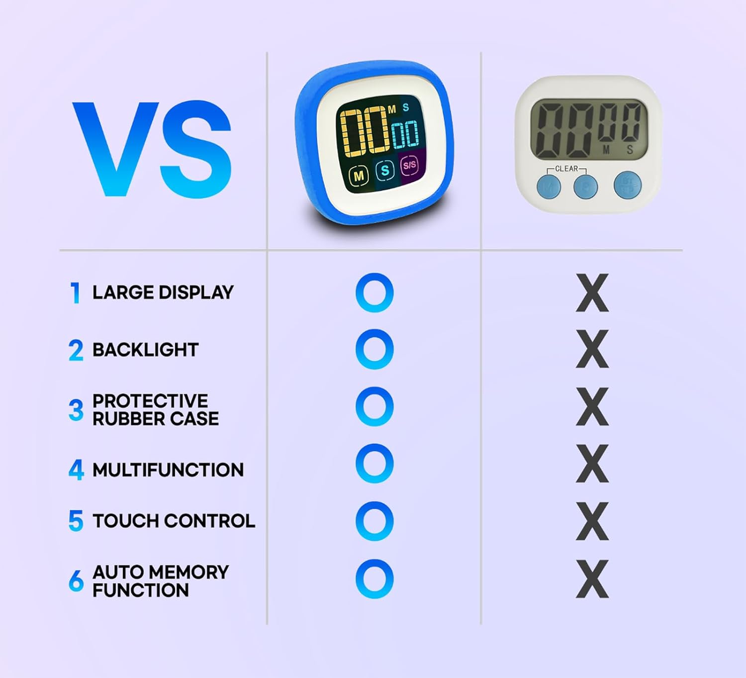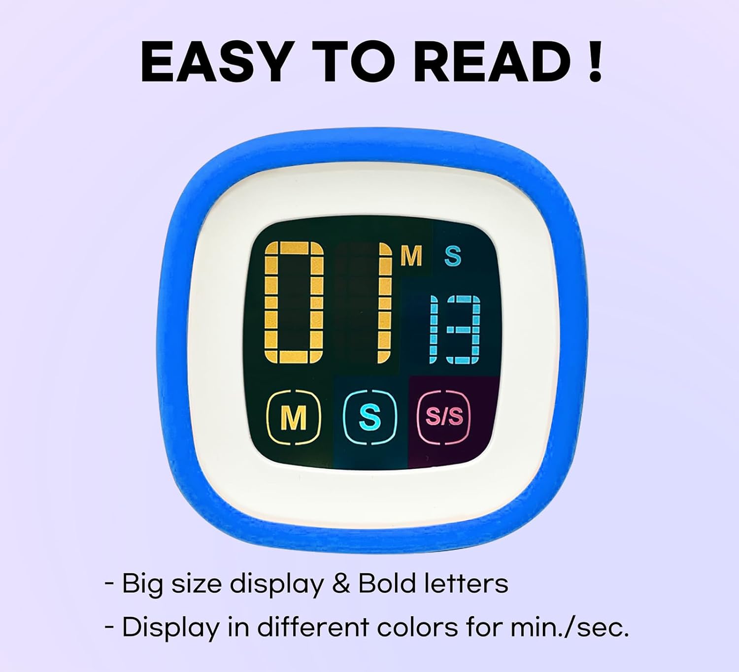 - 【 Easy to use 】 Very easy to set up and use with just 3 touch keys. Press & hold the ‘M’ key (Minutes) or ‘S’ key (Seconds) to fast forward set time, and press these two keys (‘M’ and ‘S’) at the same time to reset time to 00:00. You can also pause and restart the countdown/up by pressing ‘S/S’ key ( Start/Stop ) during the countdown/up.
