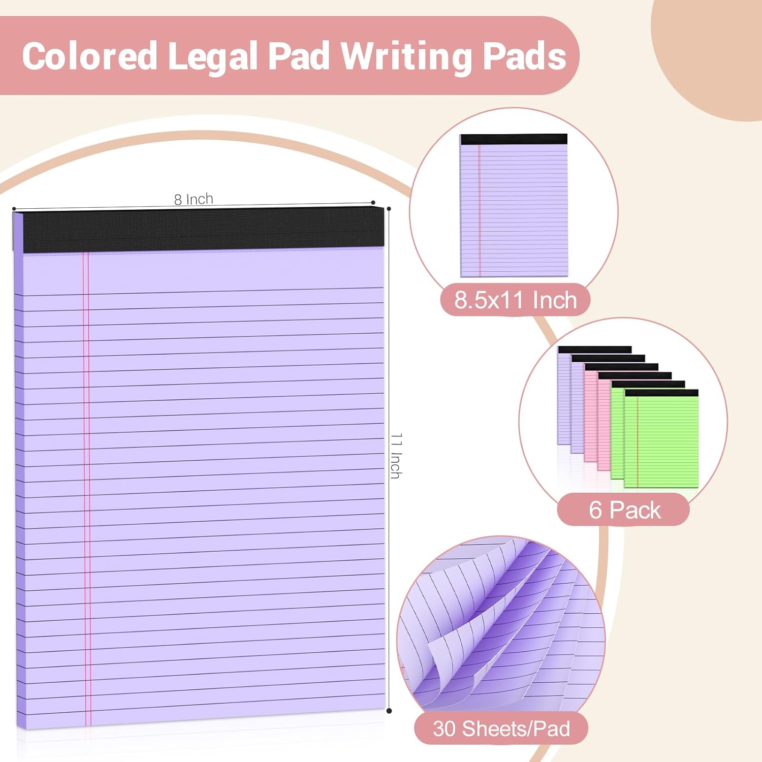 - 【Size & Quantity】The overall dimension of each legal pad is 8.5" x 11" . Wide ruled 11/32 inch line spacing for writing more notes on each sheet. You will get 6 pack of legal pads 8.5 x 11 colored, 2 of each pastel color (Pink, purple, and Green), each 8.5 x 11 lined paper pads includes 30 sheets, there are a total of 60 sheets to meet your daily usage and replacement. These Legal notepads 8.5 x 11 colored perfect for writing notes, letters, thoughts and lists.