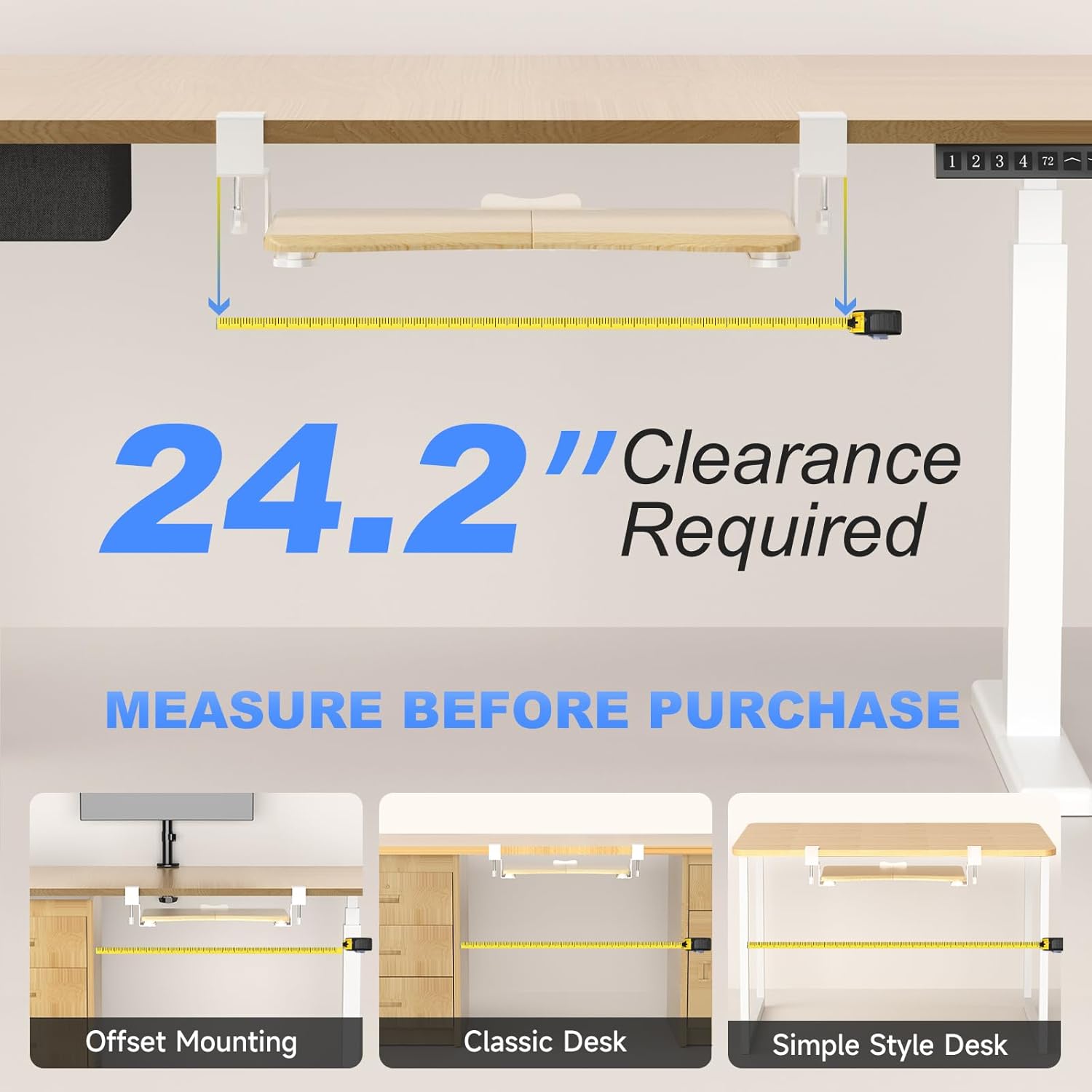 - Universal - This 20" (24.2" including clamps) x 11.8" under-desk keyboard tray holds your small keyboard, mouse, and other small accessories below the desktop to add work space. Please not it does NOT fit if your desk thickness is over 1.57”.