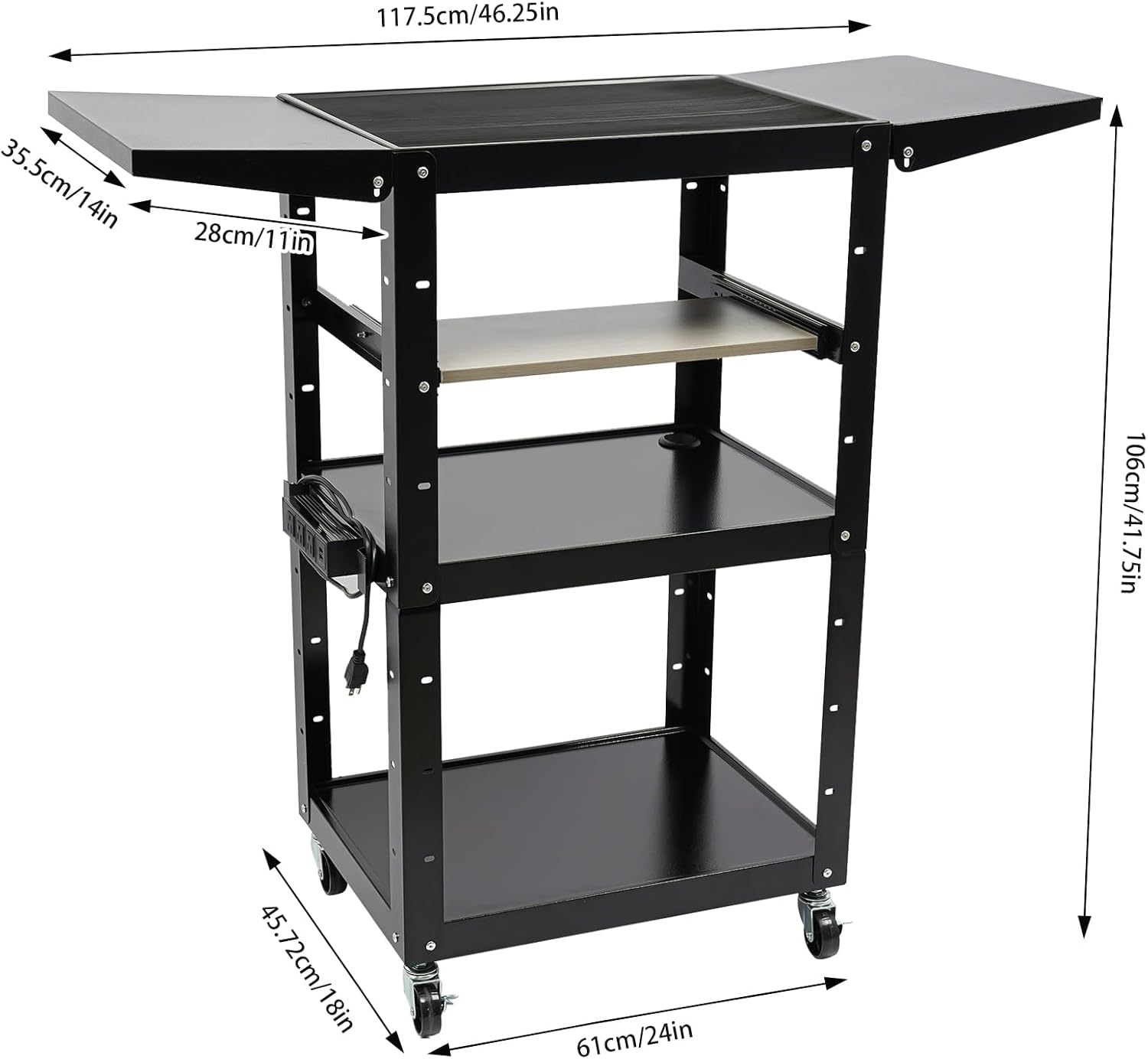 Black Steel AV Cart with Wheels & Power Strip Height Adjustable Rolling Computer Cart w/Folding Drop Leaves Media Cart Projector Cart, 300 LBs, 24 * 18 * 41.75in