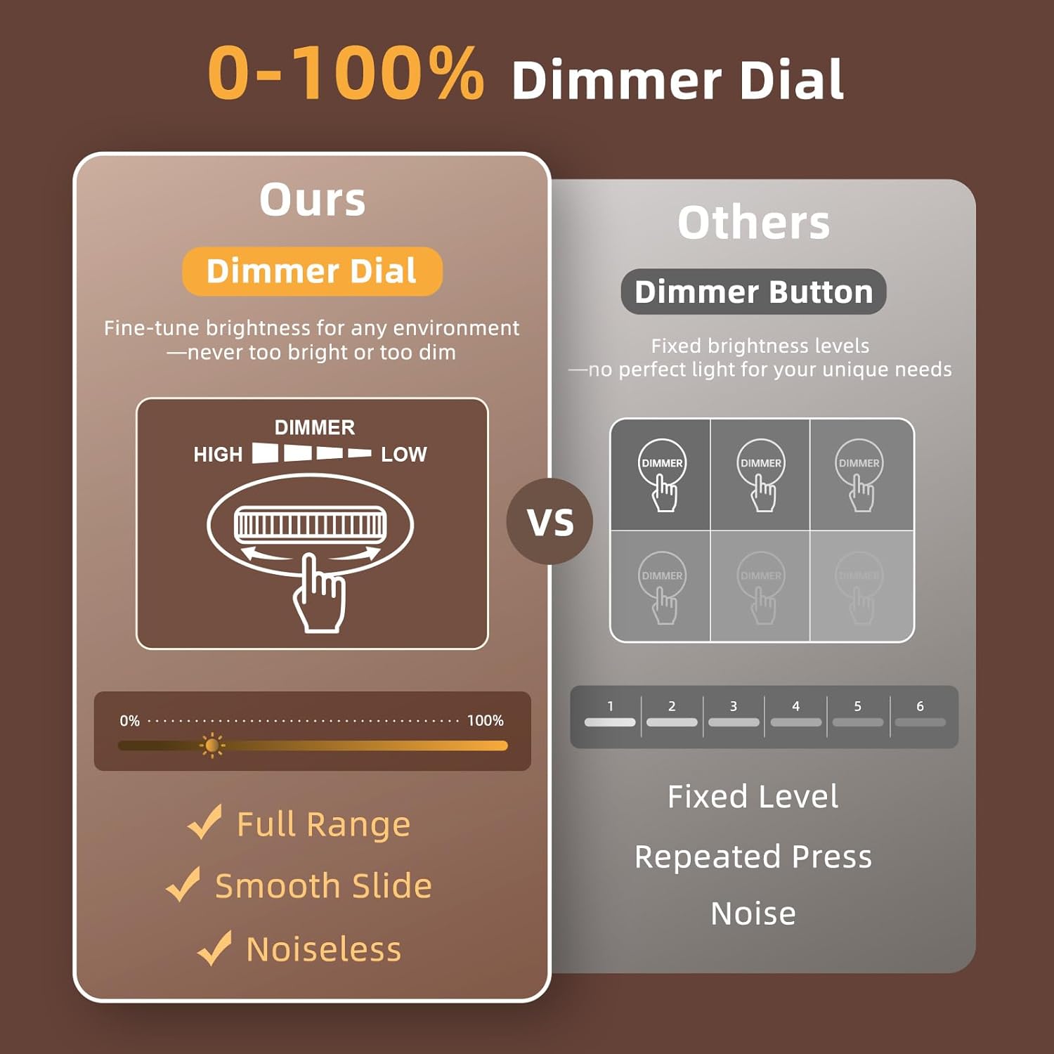 - 0-100% CUSTOMIZABLE BRIGHTNESS: The full-range dimmer allows you to fine-tune the brightness for any environment, not too bright and not too dim, perfect for your need for light. Compared to the fixed-level dimmer button, this smooth dimmer dial is ideal for light-sensitive users and elderly.