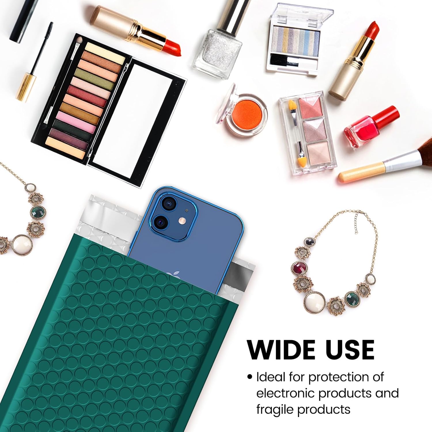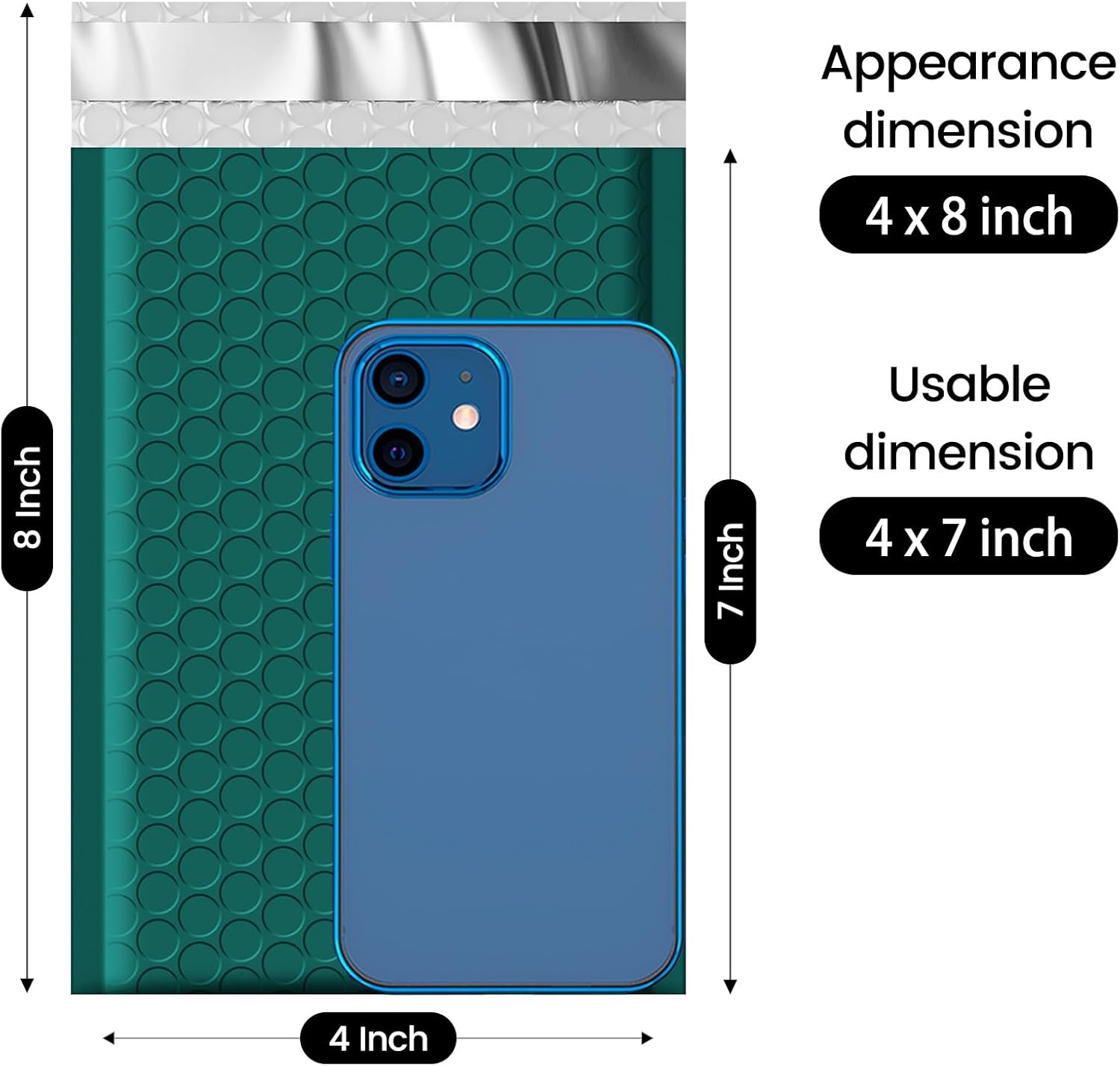 - Perfect Size Forest Green 000 Bubble Mailers: The poly bubble mailers outer size is 4x8 inch, while the inner size is 4x7 inch. It is very suitable for transporting jewelry, makeup, cards, phone case, lips, photos, handcraft and more. Great for small business packing.