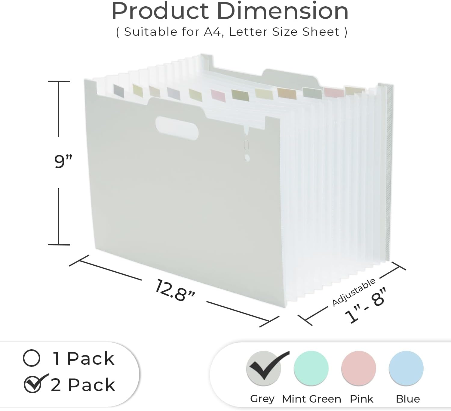 - Folder Dimension - Measuring 12.8” L x 9” H, Adjust Width from 1” to 8”. You will receive 2 of grey plastic file organizer. For further problem, please feel free to contact us