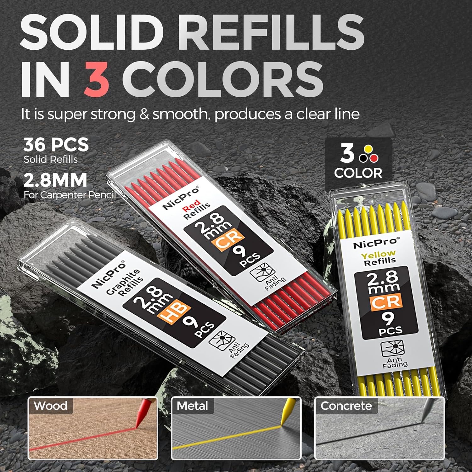 - Valued Carpenter Pencil Set: You will get 2 pcs carpenter pencils with 38 piece 2.8 mm refills, 2 protective sleeve with sharpener, 1 plastic storage box. The complete carpenter pencils combination allows you to finish your work faster and more easily