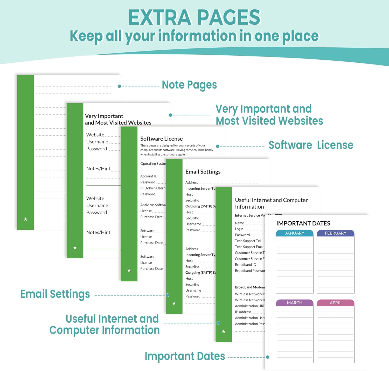 - AMPLE WRITING SPACE: This password log has 160 pages and can store up to 432 passwords. Each password entry has three lines and a colored divider for easy organization. In addition, you can record your important dates, Internet service provider, wireless router settings, Email settings, software licenses, most visited websites, and other notes.