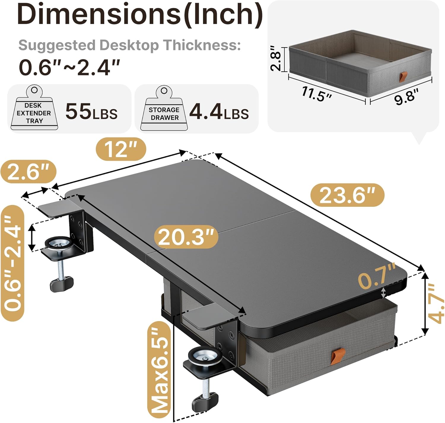 Desk Extender Tray, 24" x 12" Clamp On Desk Shelf, Desk Extension with Storage Drawer, Table Desk Arm Rest, Clamp On Keyboard Tray for Office and Home, Workstation Organizer, Medium, Black