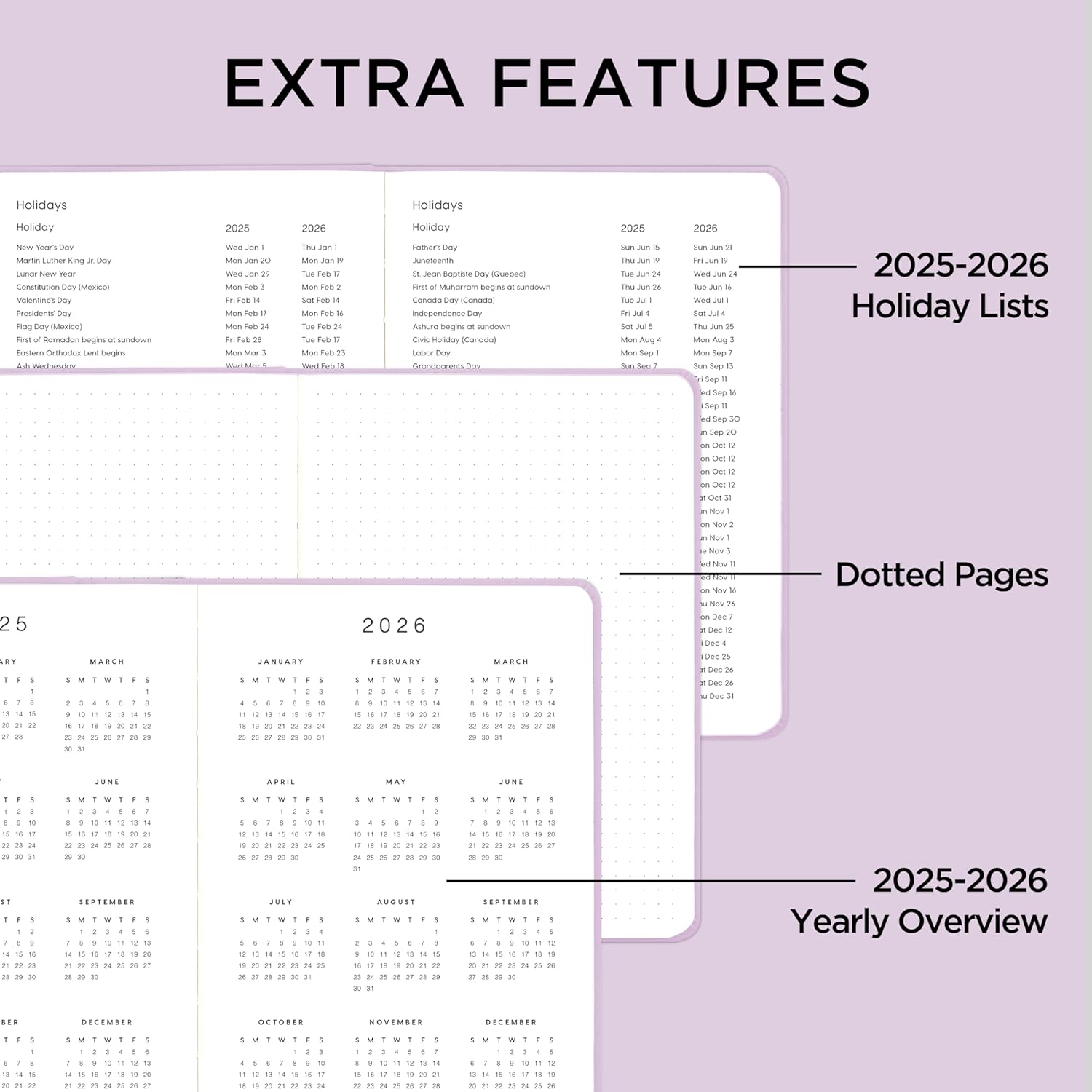 - 【EXTRA FEATURES】The planner includes 2025-2026 calendars,2025-2026 holiday lists and extra 10 dotted pages to write down your thoughts. 12 PCS monthly tab stickers and 2 ribbon bookmarks for easy navigation and finding.