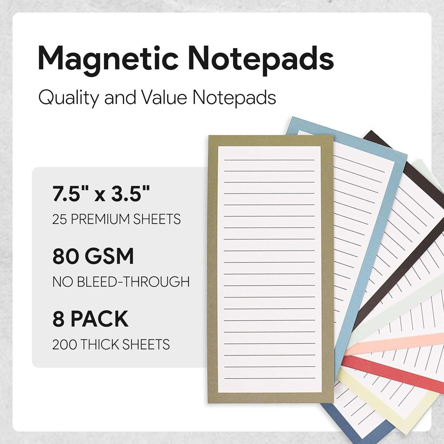 - QUALITY & VALUE BULK NOTEPADS- Total 8 notepads value pack bundle. Strong Magnetic back, optimal size 7.5 x 3.5 inches, each notepad made with 25 thick sheets (80GSM thick). SAVE TIME AND HASSLE - Why search frantically for pieces of paper when the magnetic notepad is always within your reach? These 8 magnetic notepads can be placed on the kitchen fridge, in the garage, filing cabinet, or gym locker. Take down important notes and reminders and never forget what’s important