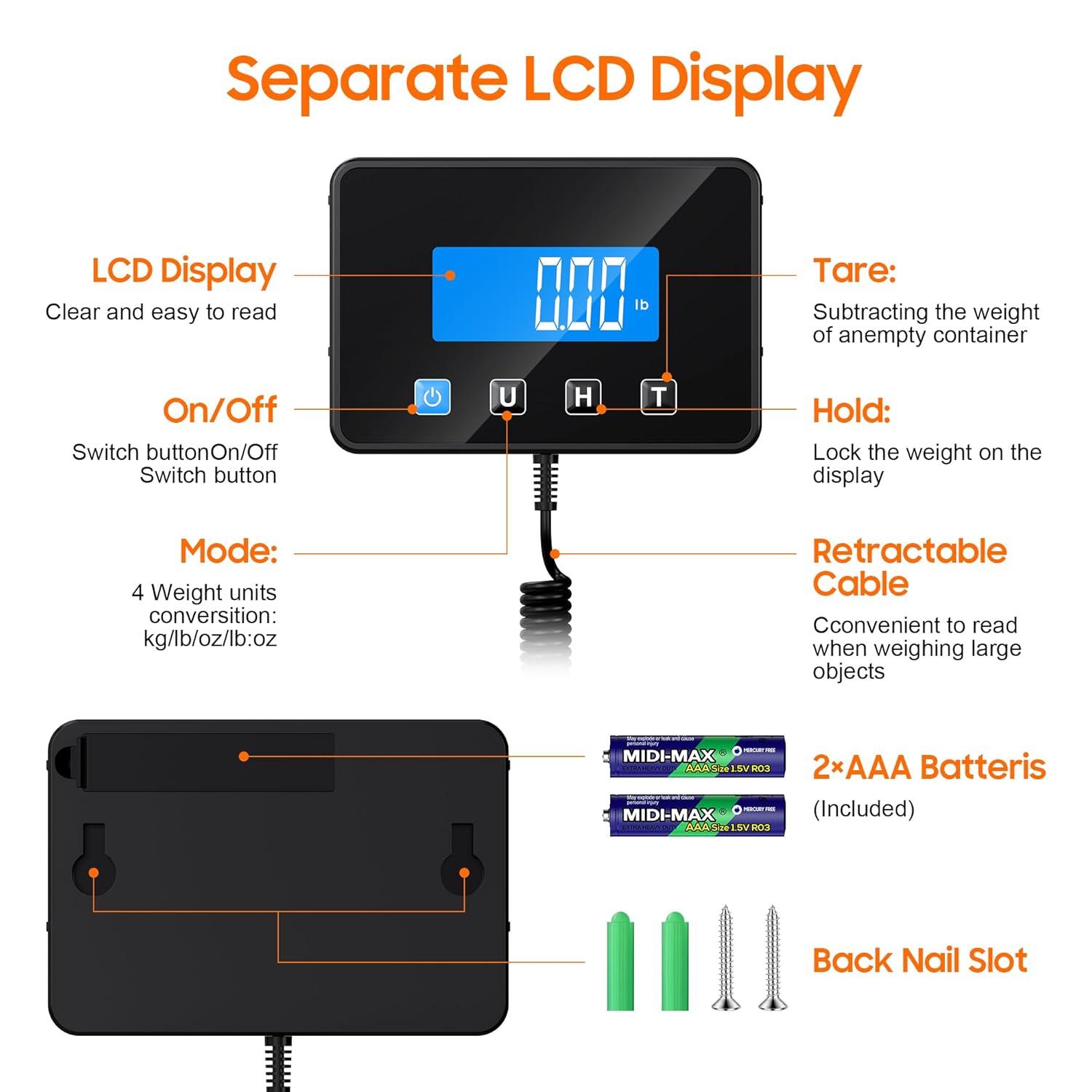 - Never Block View & Easy Reading: Our postage scale features a separate display connected by a 2-meter spring line, ensuring your view is never obstructed. The line retracts to 0.55 meters for convenience. With nail holes for wall mounting and a large, backlit LCD display, it's perfect for dimly lit workspaces as well.