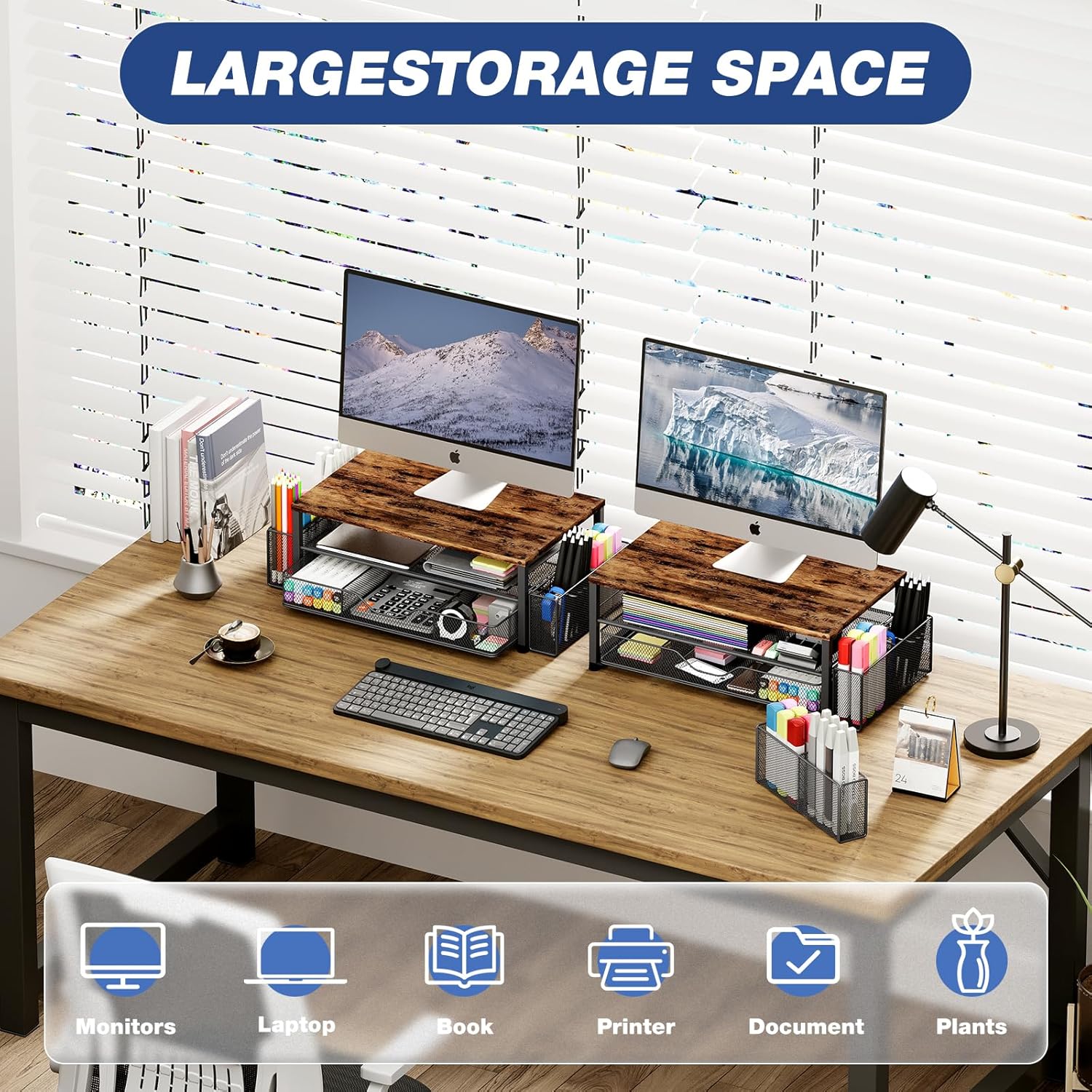 - 【Save Space】:This 2-Tier monitor stand with drawer and 2 hanging pen holders provides ample storage space to keep your office supplies and office desk accessories neatly organized and easily accessible, keeping your workspace tidy and improving your sense of well-being