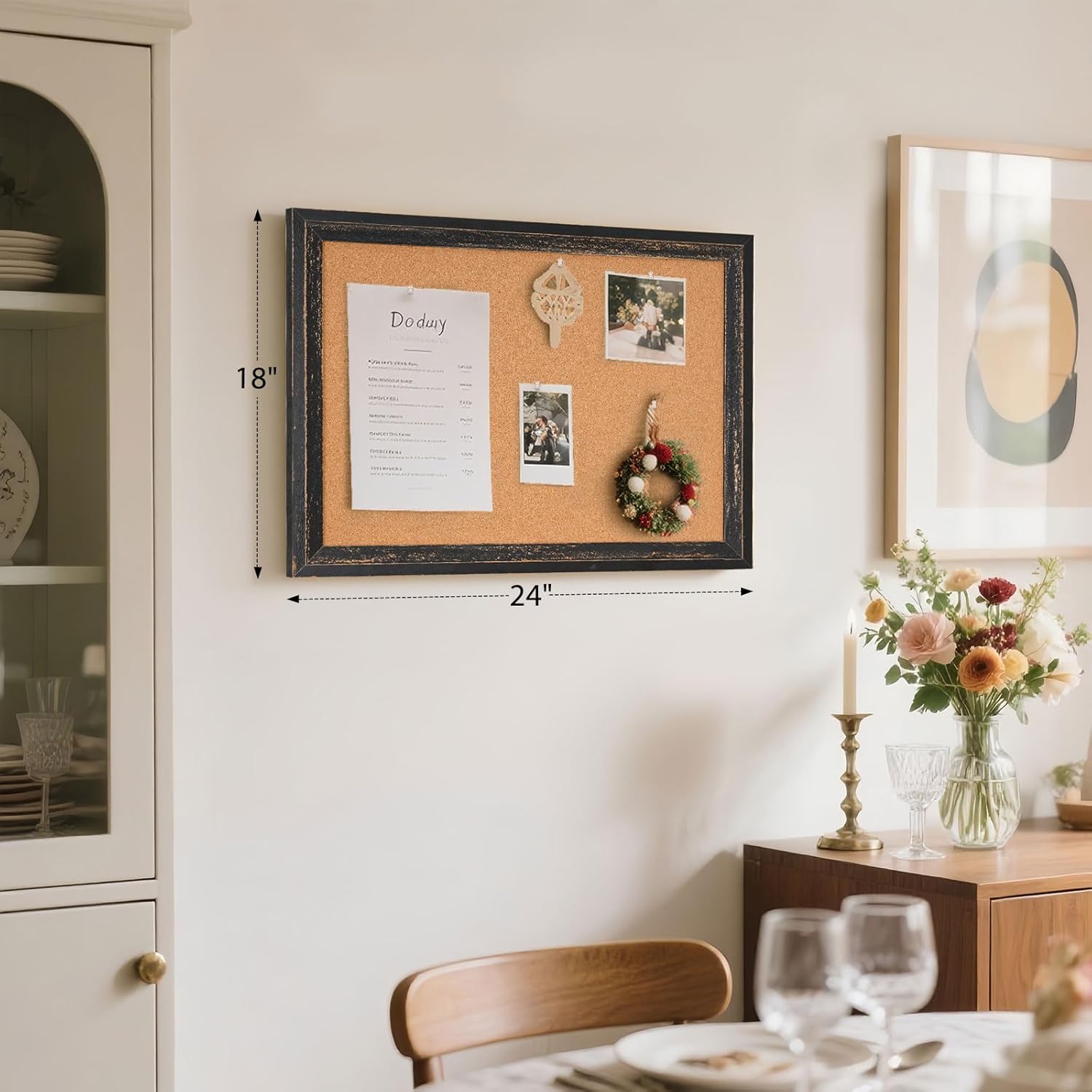 Cork Board Bulletin Board - 24" x 18" - Rustic Black Frame Corkboard for Wall - Decorative Pin Board, Message Board, Vision Board, Picture Board, Photo Board