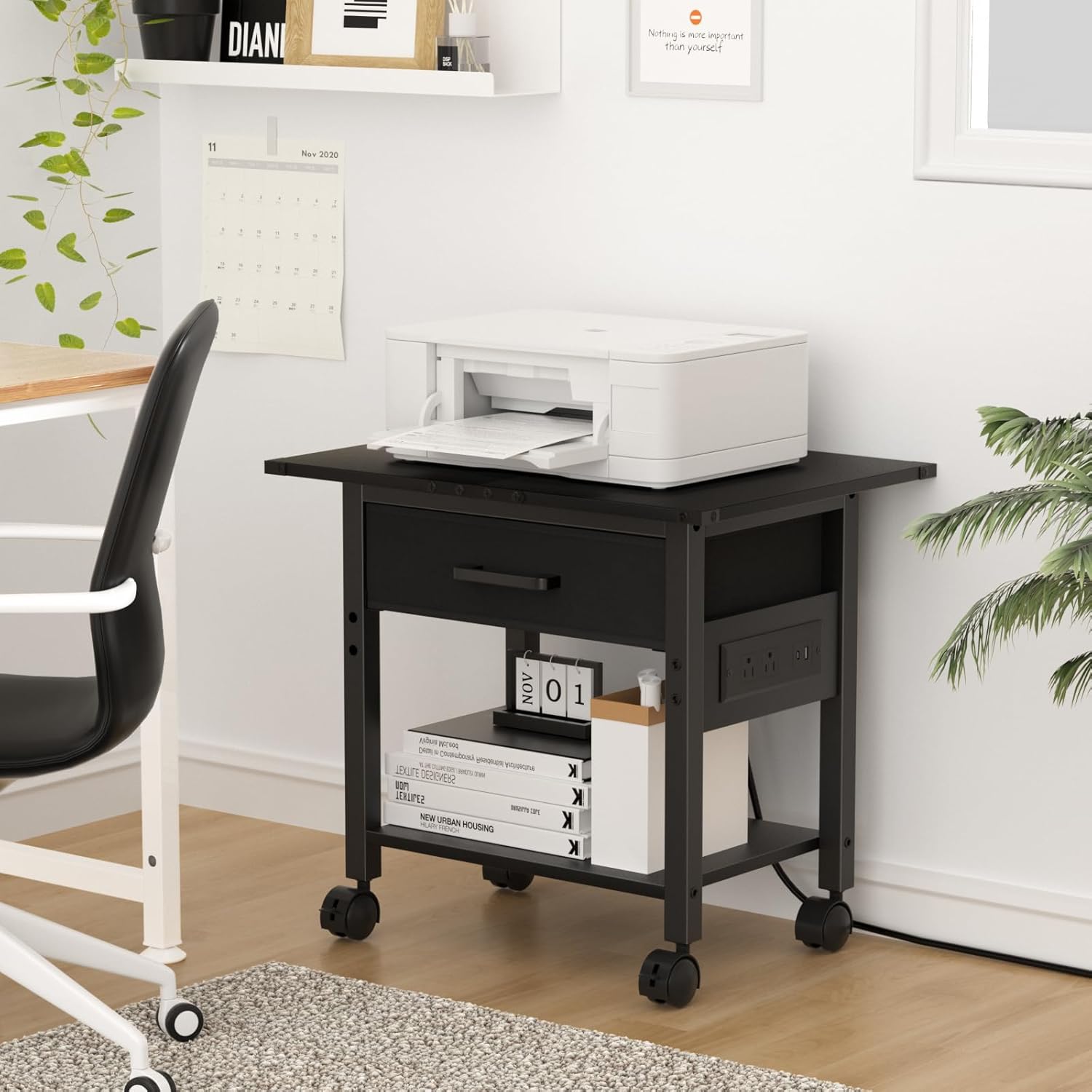 - [Printer stand with Charging Station] The two standard plug sockets and USB interfaces of the office printer stand can simultaneously charge your printer and other office machines. The wide industrial printer stand is supported by sturdy steel tube frame and thick wood panels. Its solid construction ensures long term use. Its excellent weight capacity is up to 140 lbs, which provides excellent stability. It can accompany you for many years.