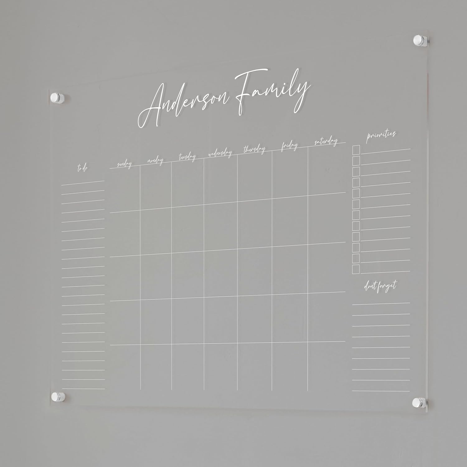Personalized Clear Acrylic Calendar for Wall, Calendar Whiteboard for Wall, Dry Erase Wall Calendar, Wall Calendar Organizer System for Home (Cursive, White, 38"W x 26"H)