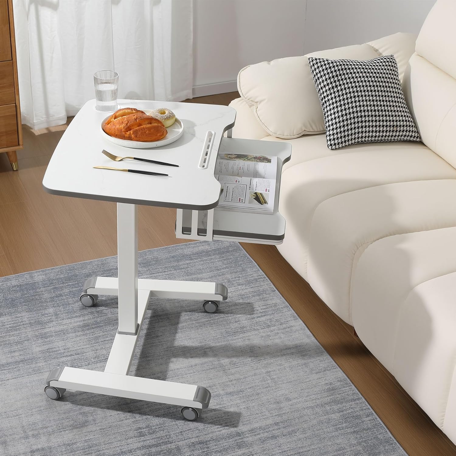 - 【Versatile Mobile Standing Desk with Keyboard Tray】 This rolling desk combines portability and functionality, featuring a spacious 23.6 x 11.8 keyboard tray to comfortably fit a full-size keyboard and mouse. The built-in desk drawer offers extra storage, while the marbled wood tabletop (26.7L x 19.6W) includes a cup holder and 0.9 slot for organizing drinks, phones, or tablets.