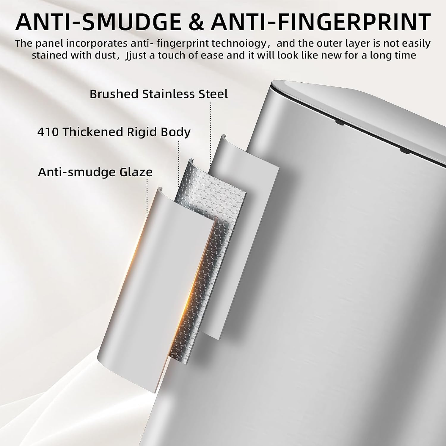 - DURABLE: Our kitchen trash can features a high-quality stainless steel finish and a heavy-duty plastic inner bucket for exceptional durability. The fingerprint and smudge-resistant coating makes cleaning a breeze!