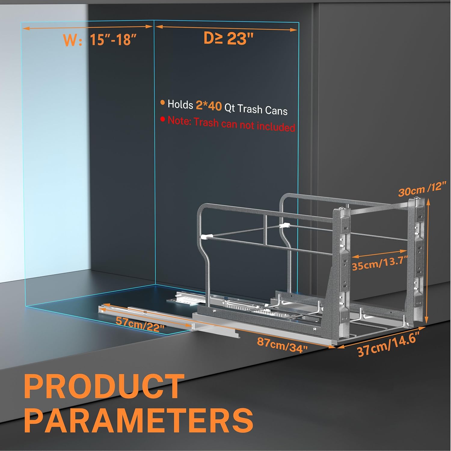 - Premiun Material: Trash can cabinet pull out is made of high-quality carbon steel with powder-coating surface for durability and rust resistance, allowing you to clean it with a cloth. Made for a trash can kitchen of 28 to 40 quarts (7–10 gal, 26–37 l) in volume, the frame can carry 120 pounds, 60 pounds more than regular slides.